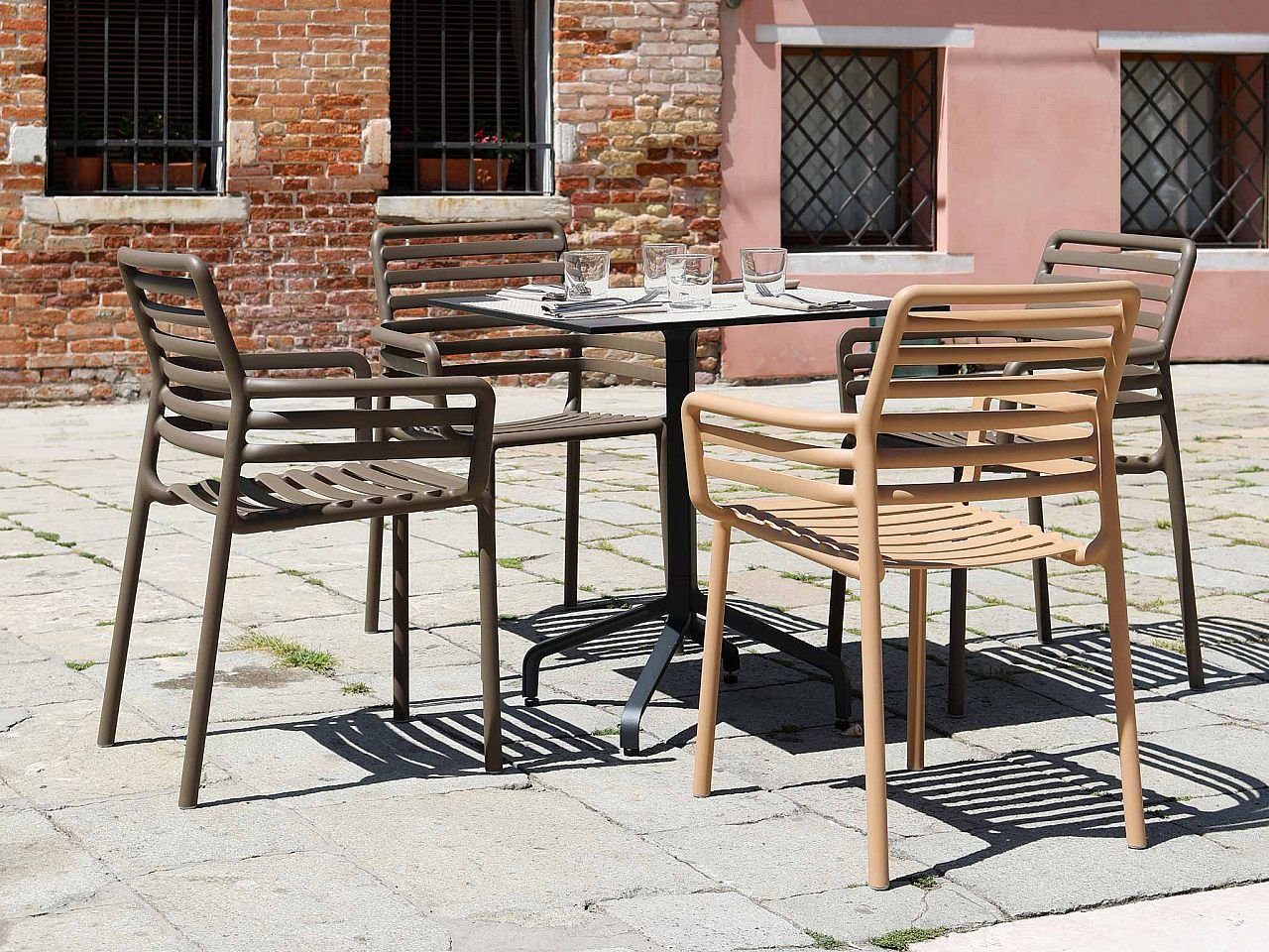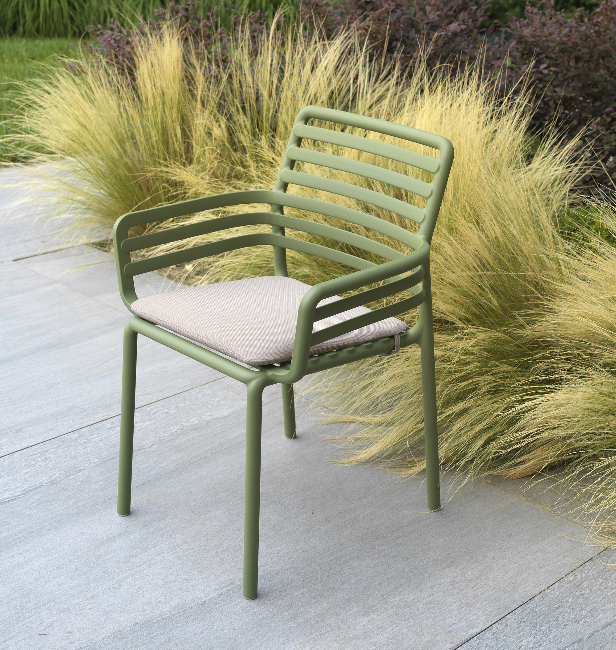 Chaise monobloc avec accoudoirs. Matière : polypropylène fibre de verre traité anti-UV, teinté dans la masse. Empilable. Finition mate. Equipé de pieds antidérapants. Coussin disponible sur commande. Résine recyclable.