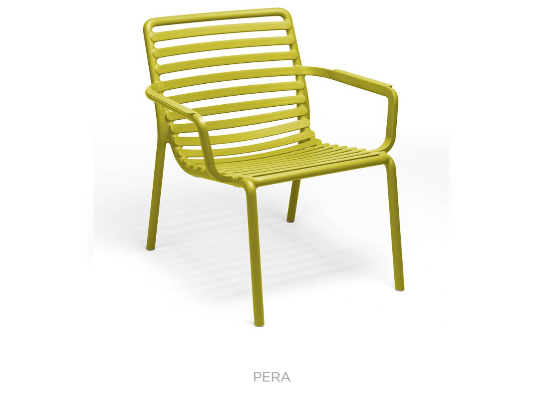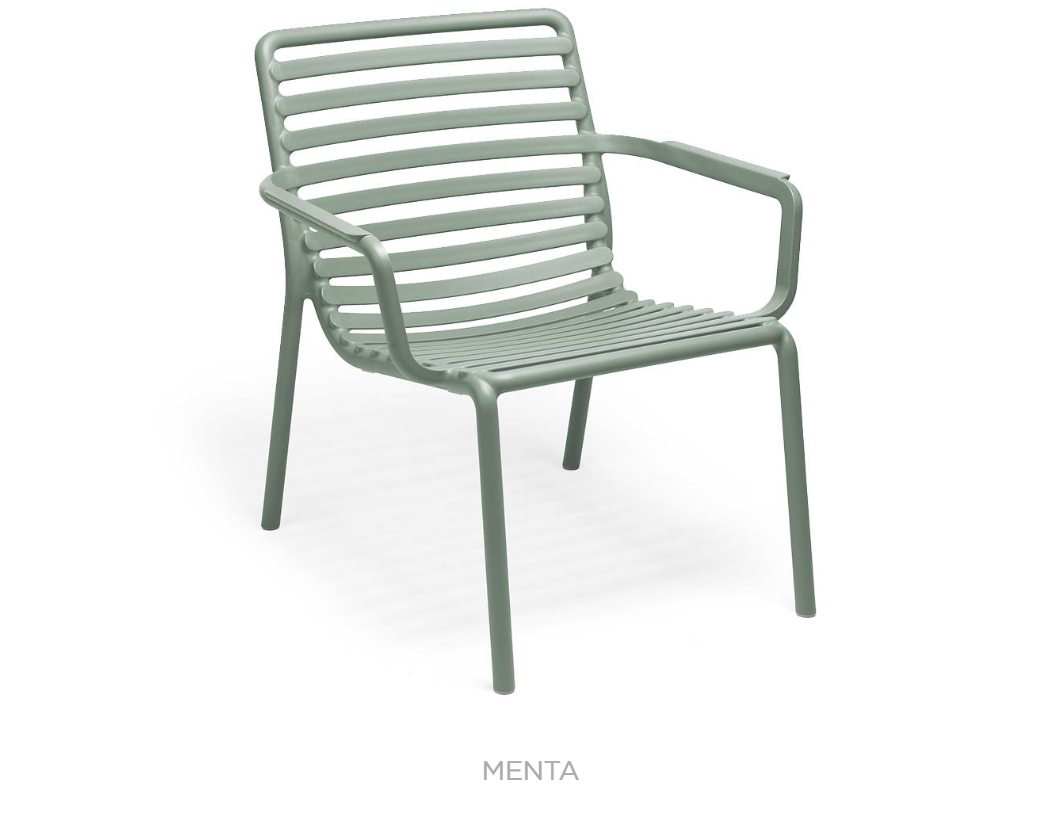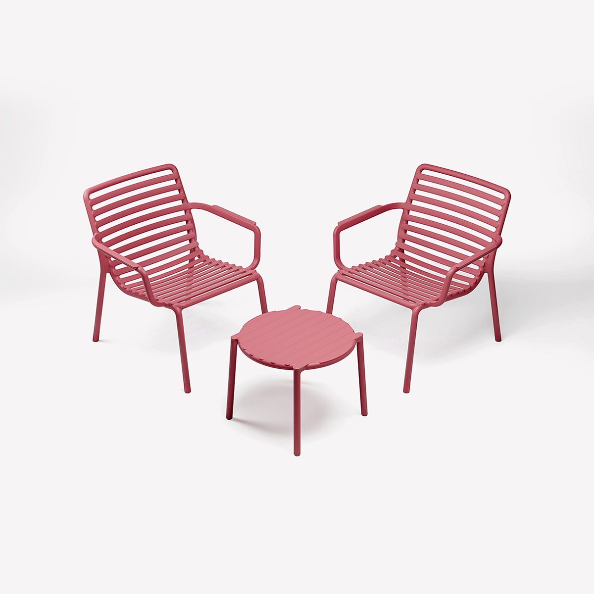 Grand fauteuil bas de détente pour l'extérieur en résine de fibre de verre caractérisé par un jeu de pleins et de vides ponctué d'une séquence de lattes horizontales. Empilable, facilement désinfecté et recyclable.
