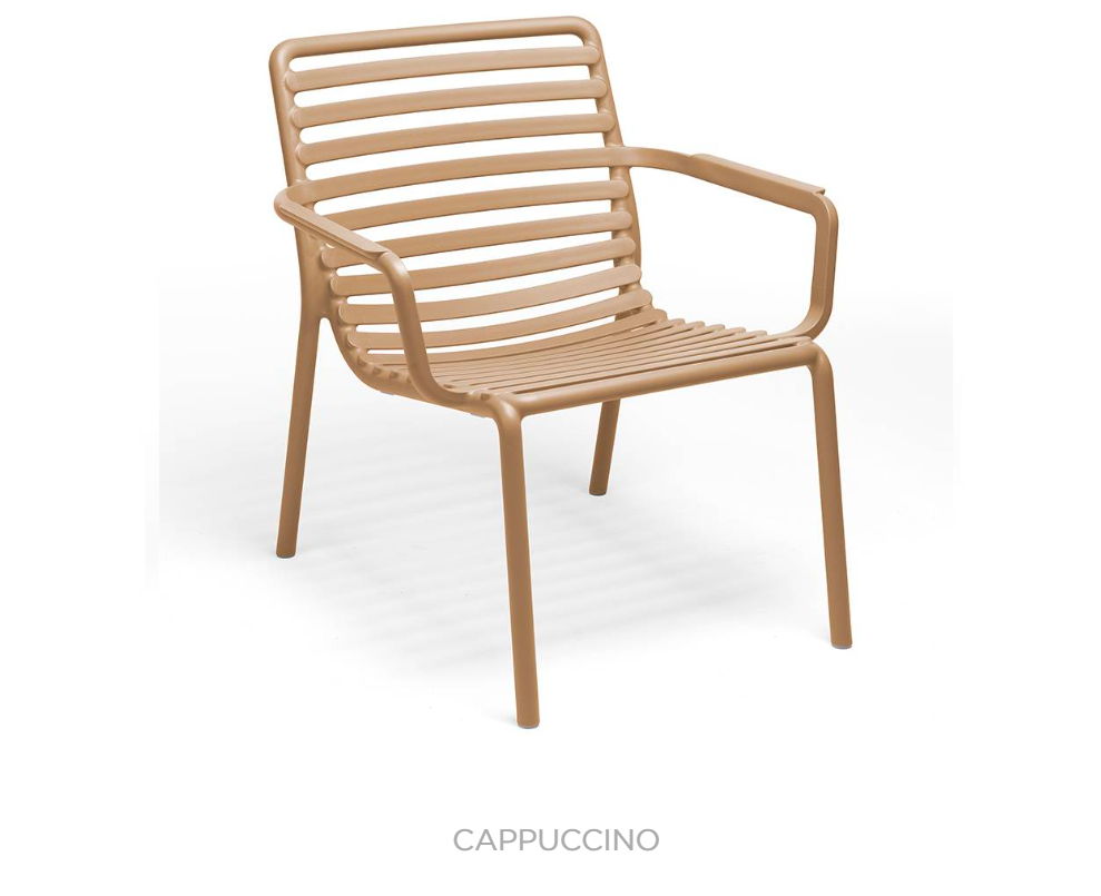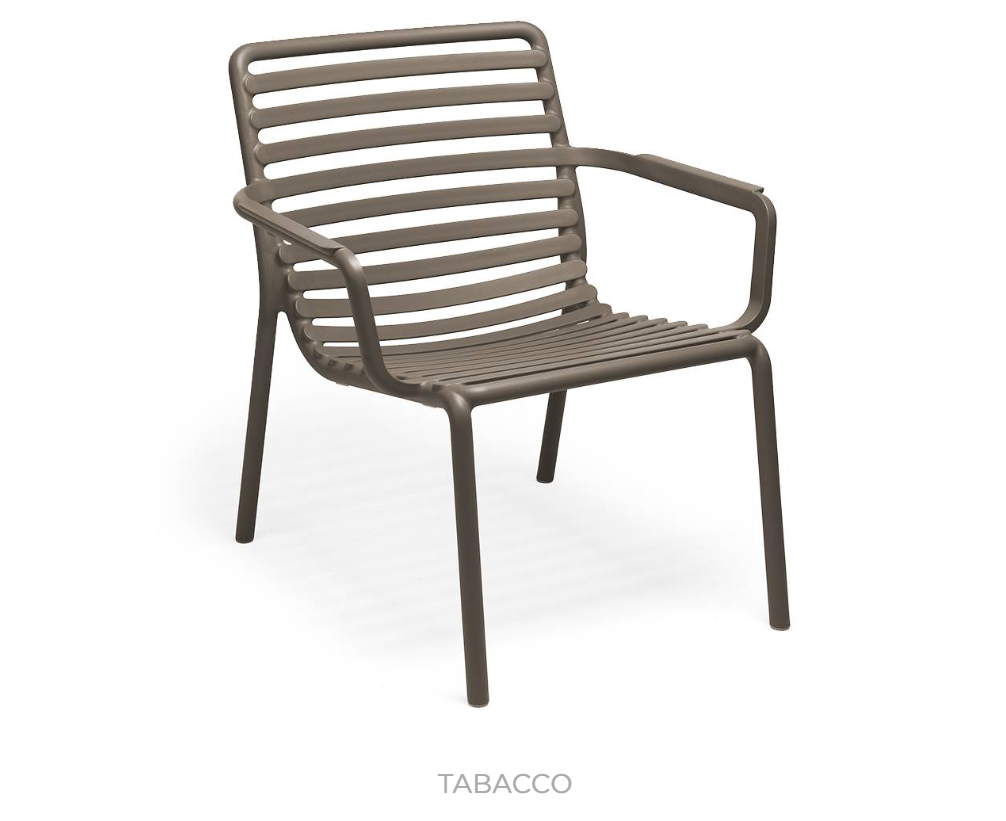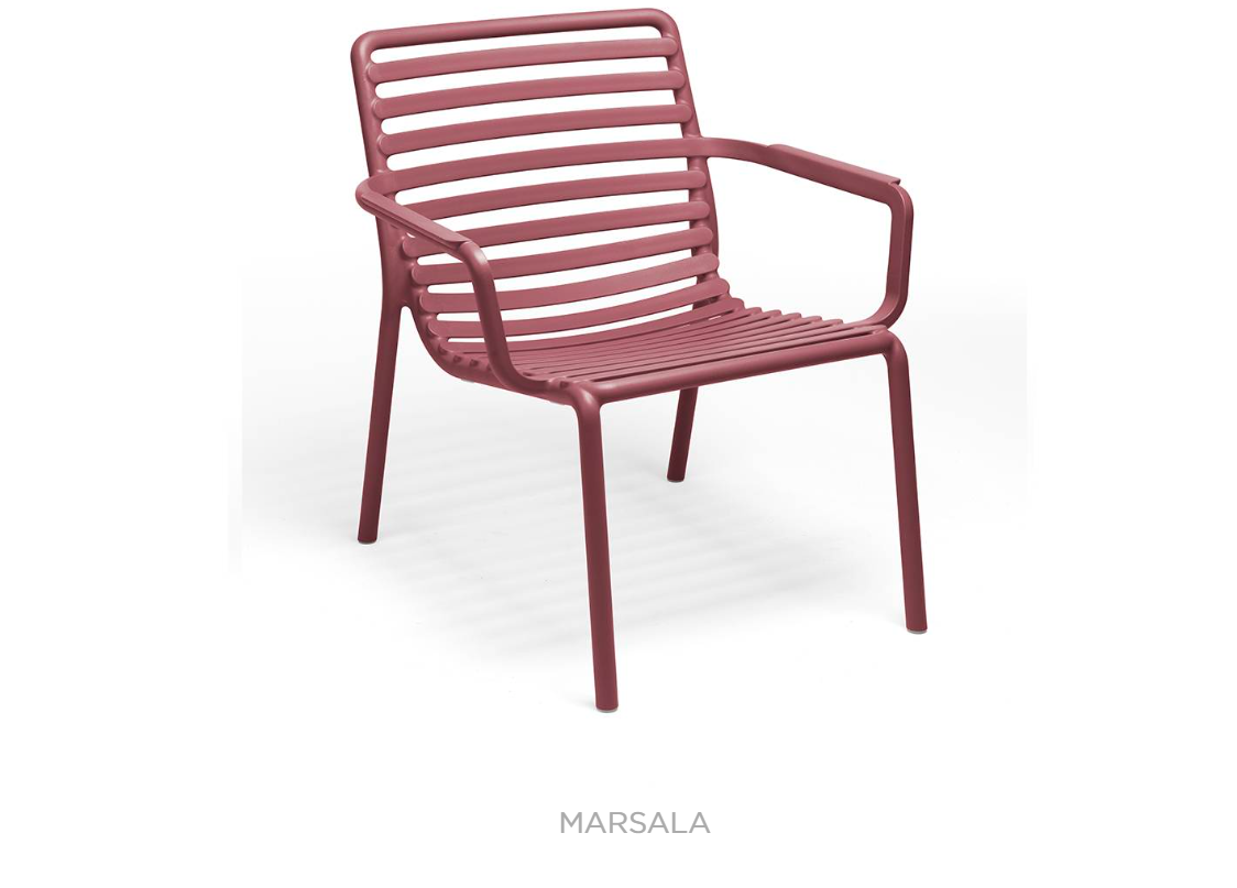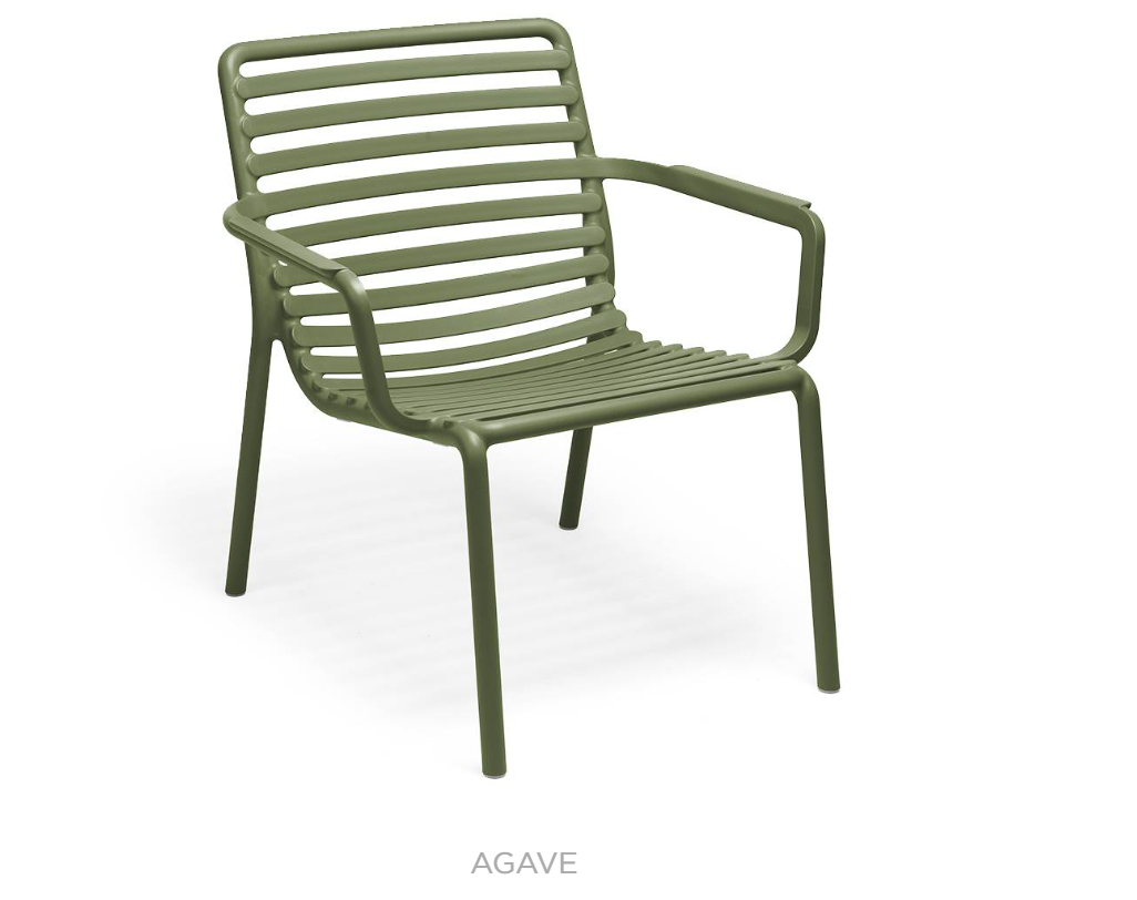 Grand fauteuil bas de détente pour l'extérieur en résine de fibre de verre caractérisé par un jeu de pleins et de vides ponctué d'une séquence de lattes horizontales. Empilable, facilement désinfecté et recyclable.
