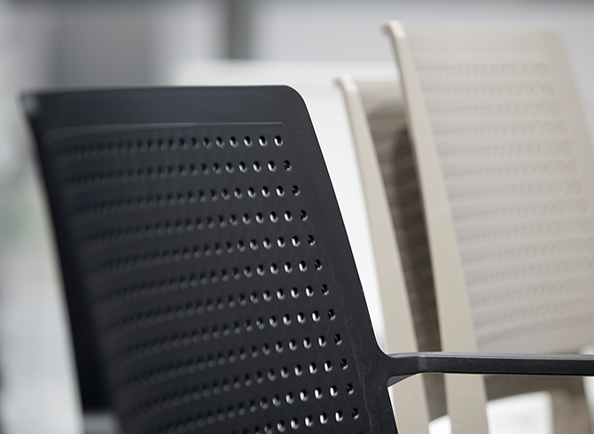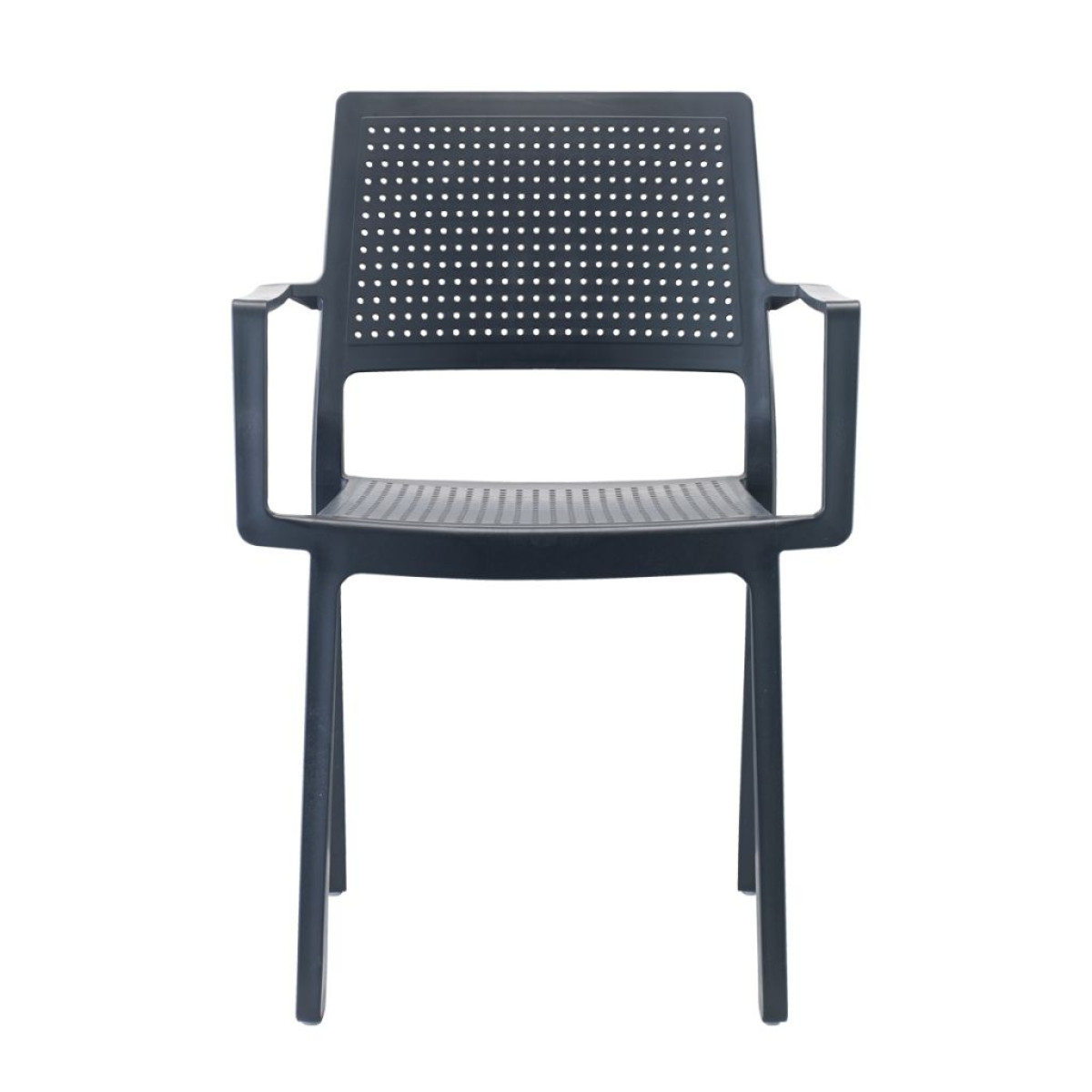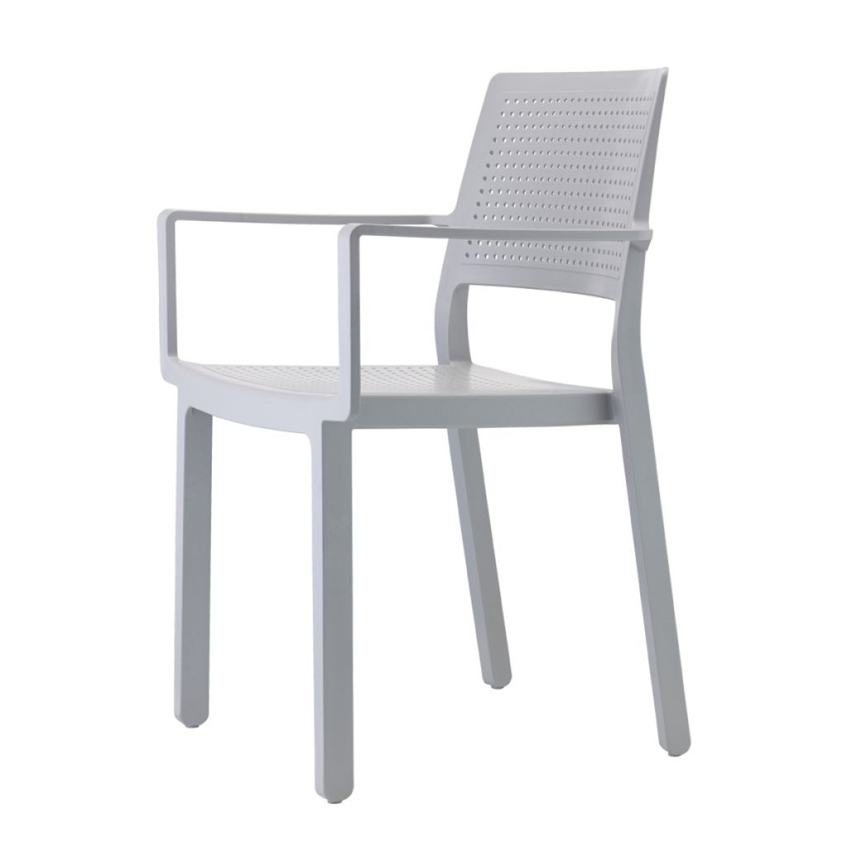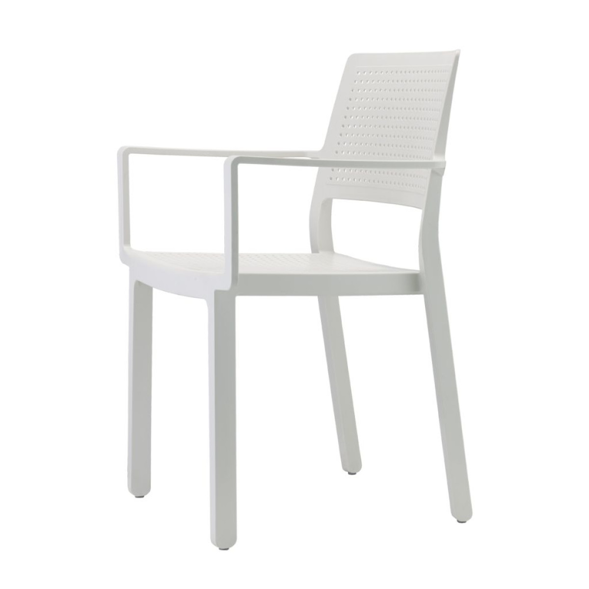 La chaise EMI avec accoudoirs est réalisée en polypropylène monocoque, avec assise et dossier micro-perforés, offrant une haute résistance à l'usure et aux agents atmosphériques.