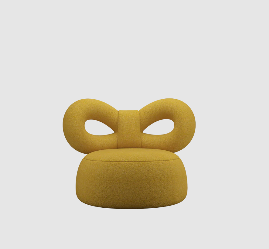 Le fauteuil Ribbon de Nika Zupanc pour Qeeboo allie confort et féminité, avec le dossier ruban emblématique et un revêtement en tissu Orsetto doux.