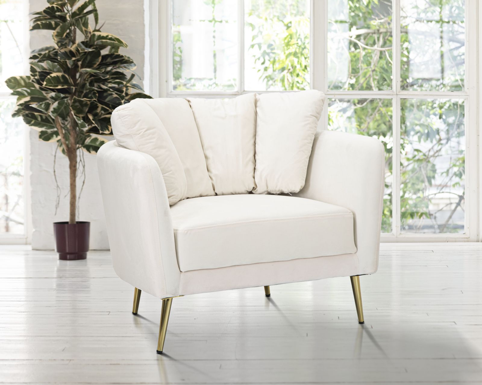 Fauteuil en tissu rembourré beige aux lignes douces et enveloppantes, les pieds en métal doré donnent une touche de classe et de luminosité.