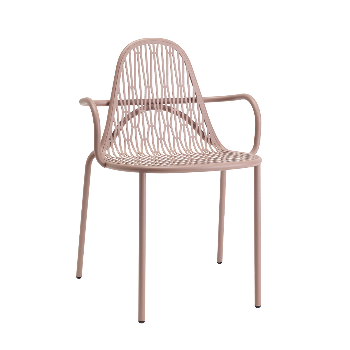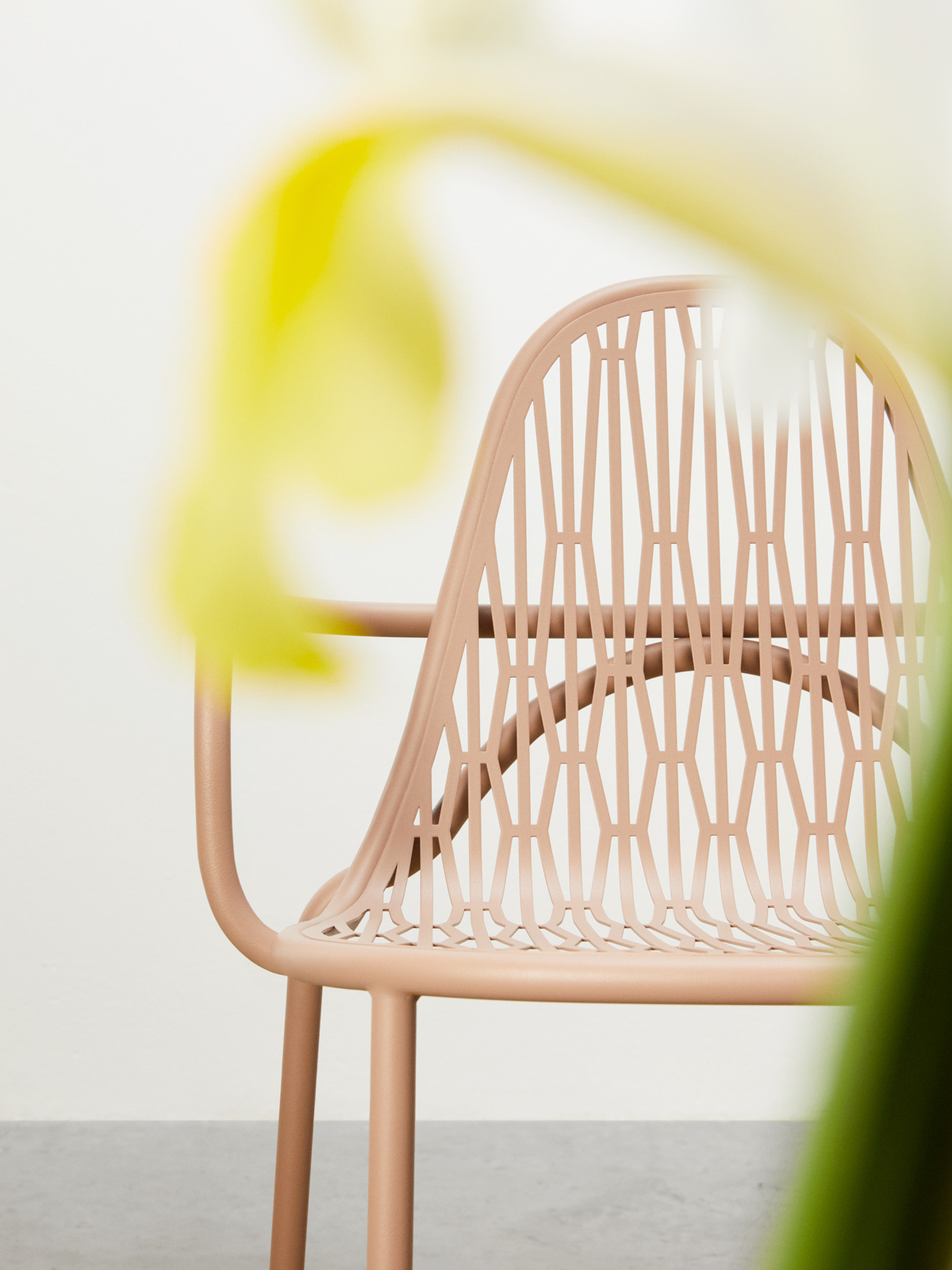 Malvasia est un siège d'extérieur qui, à travers ses textures métalliques, crée des entrelacs raffinés d'ombre et de lumière.