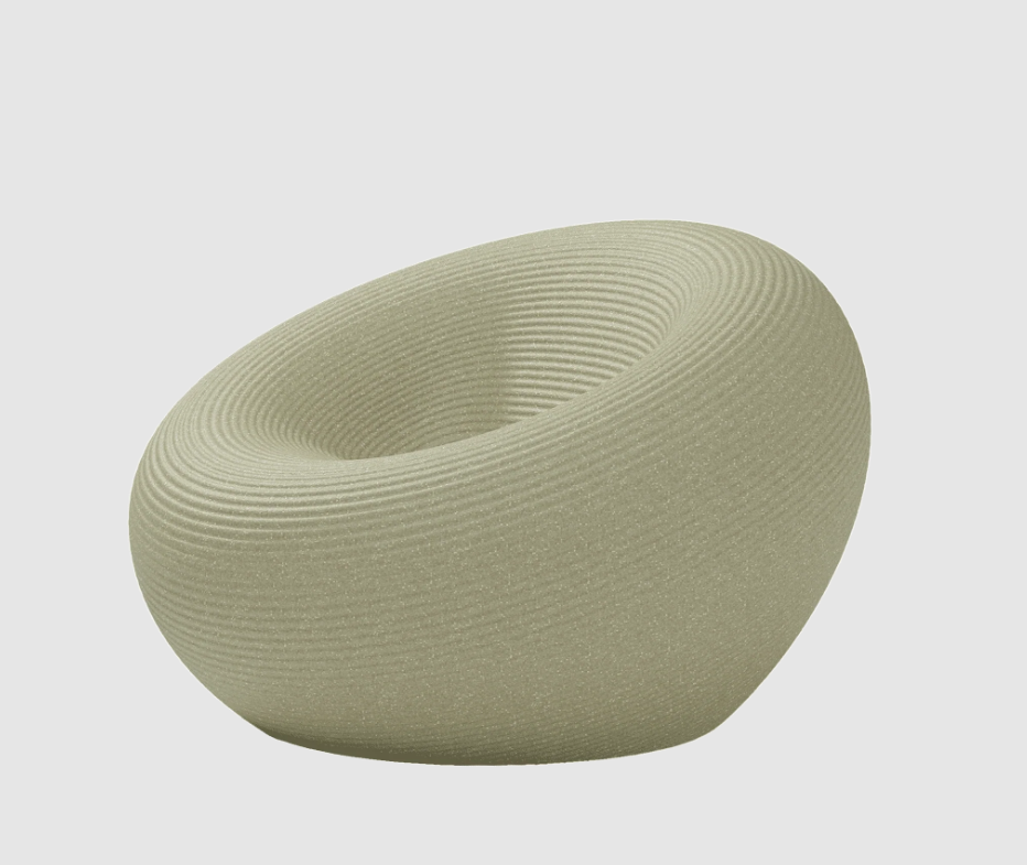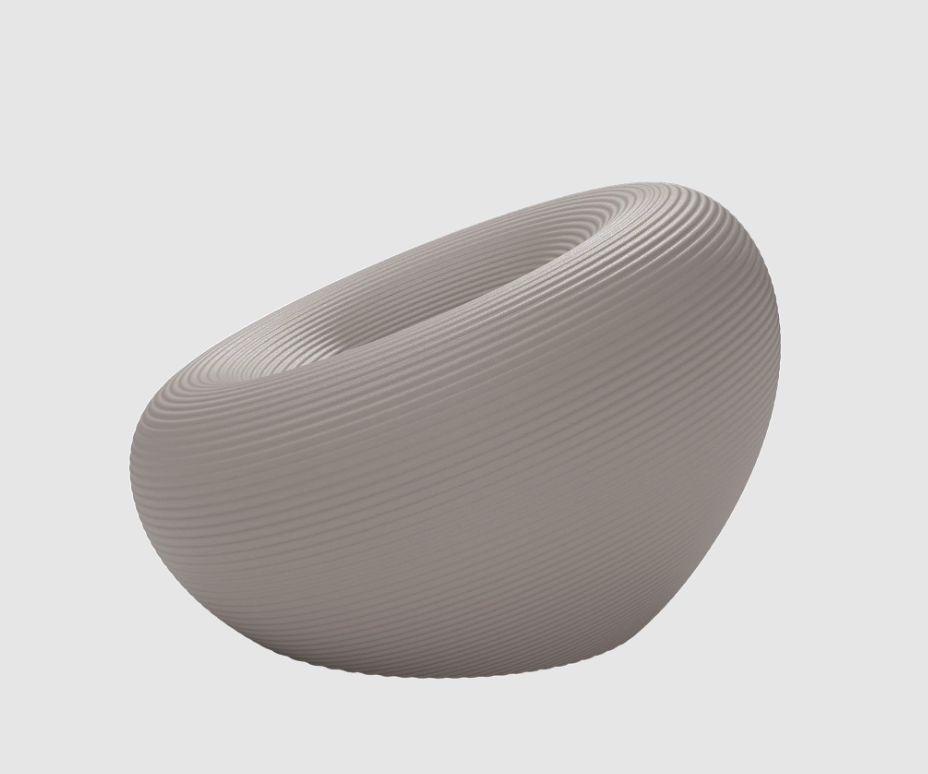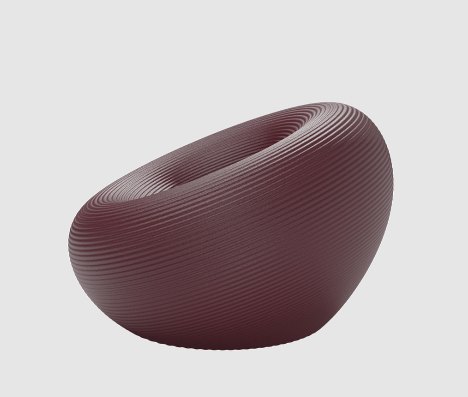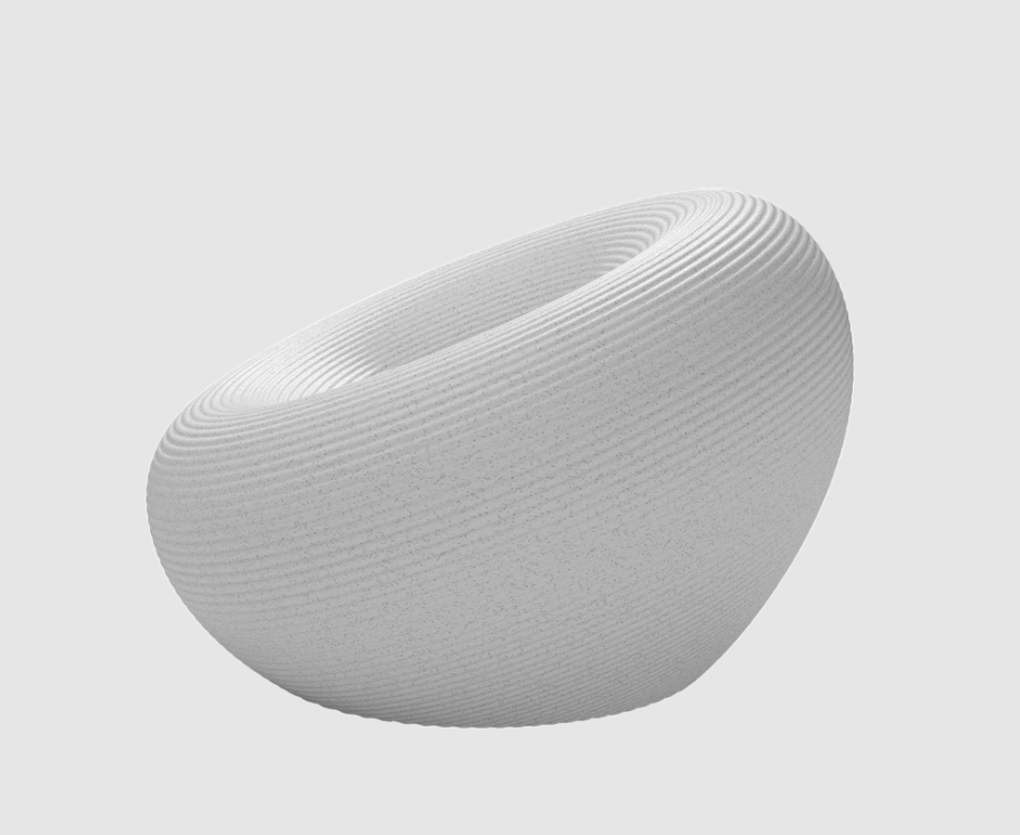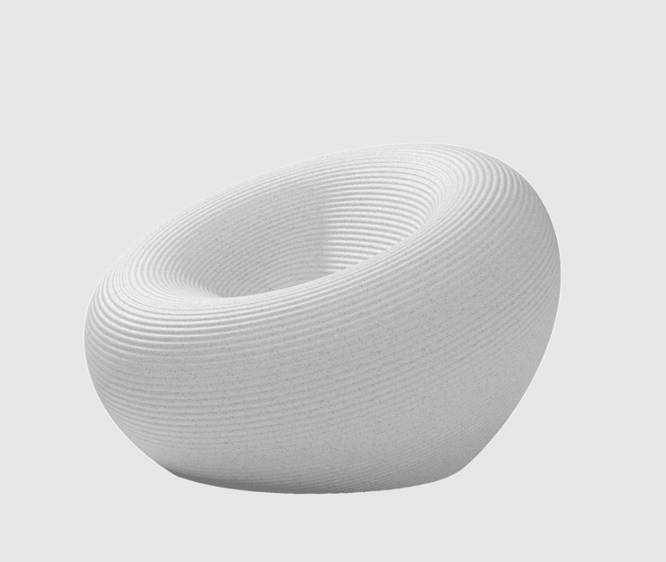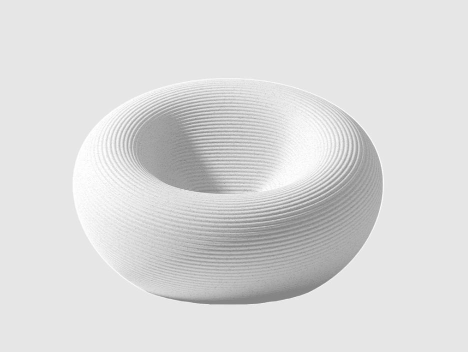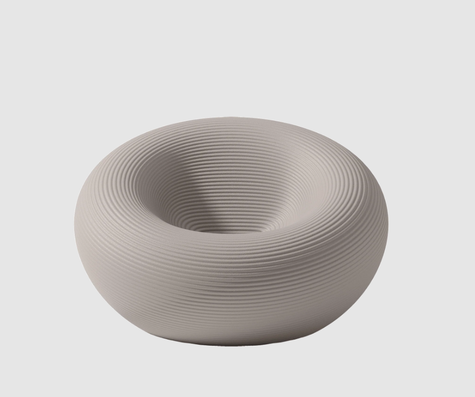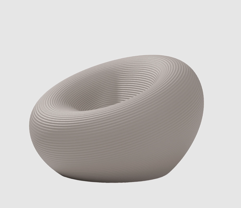 Fauteuil d'extérieur de forme circulaire, avec un canal pour l'évacuation de l'eau et une surface avec des anneaux concentriques.