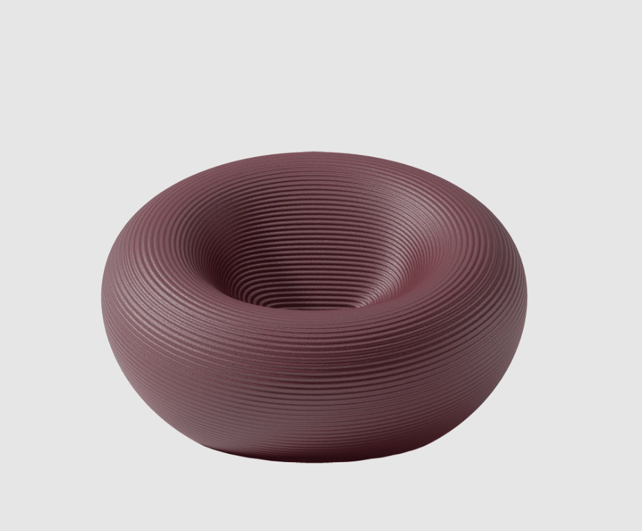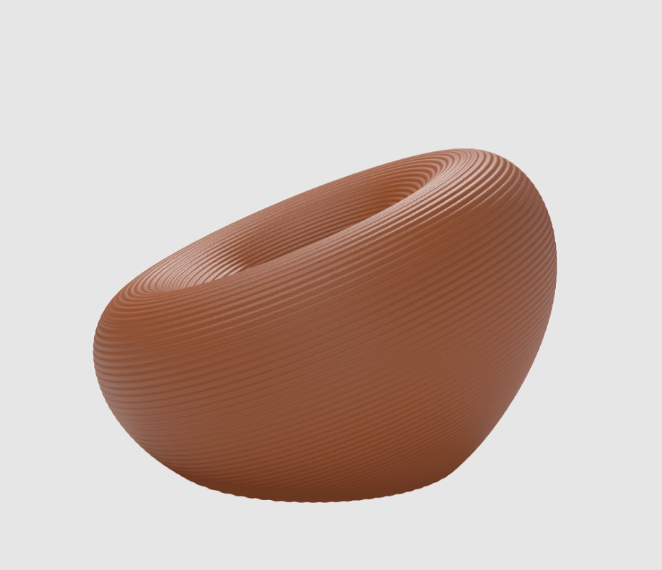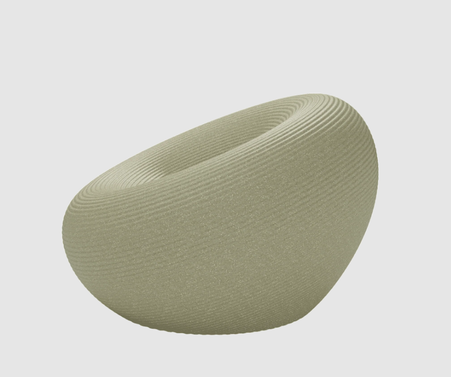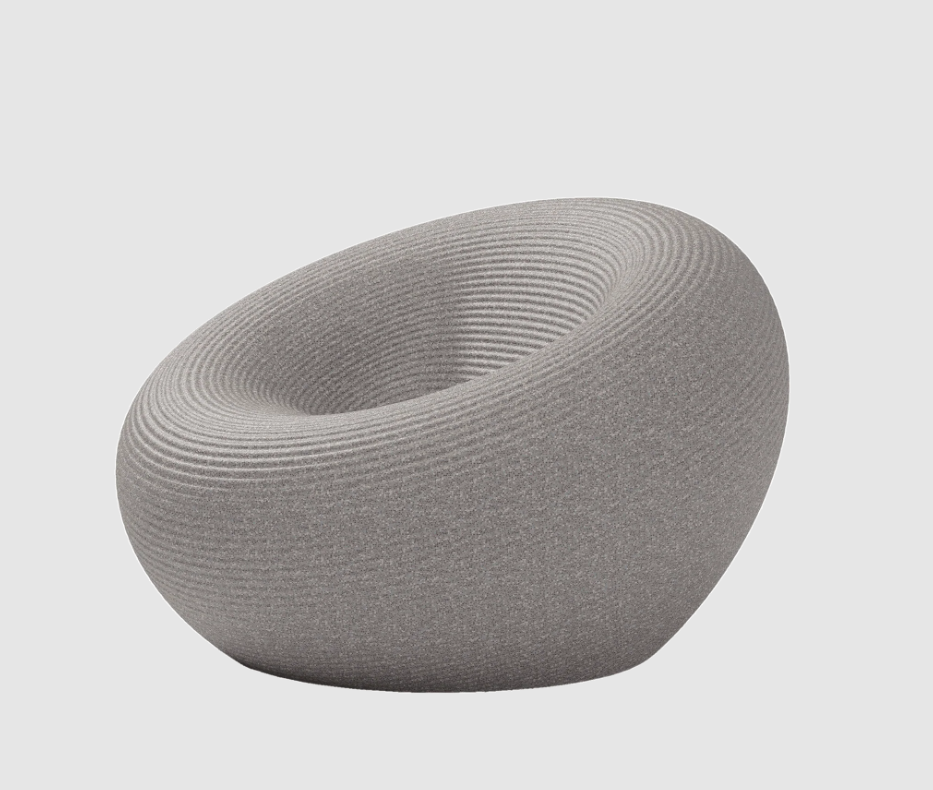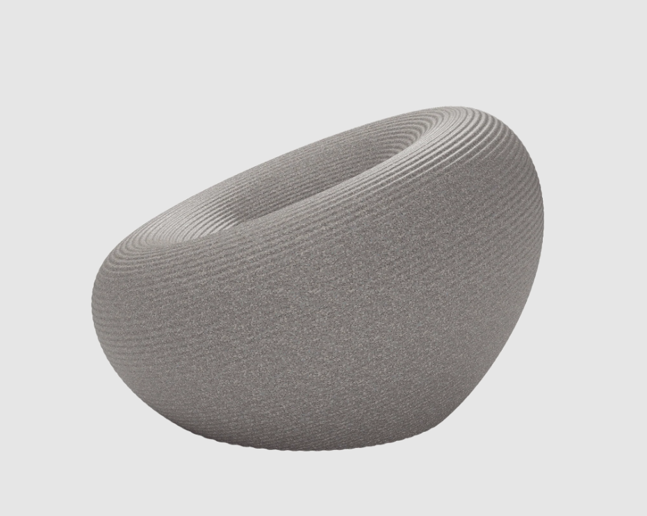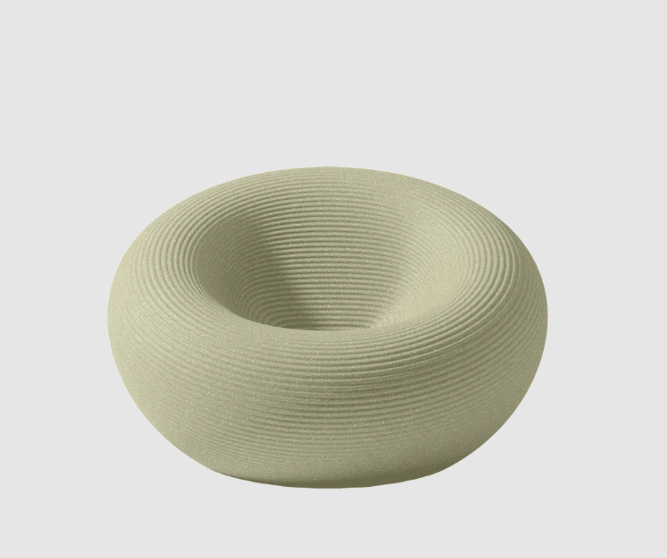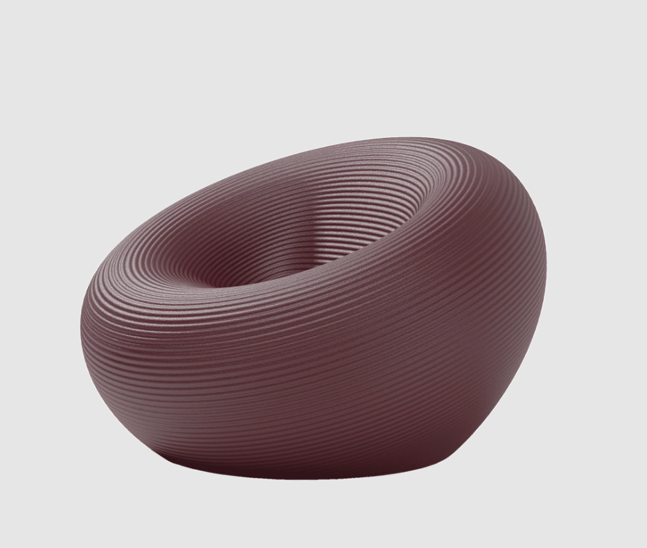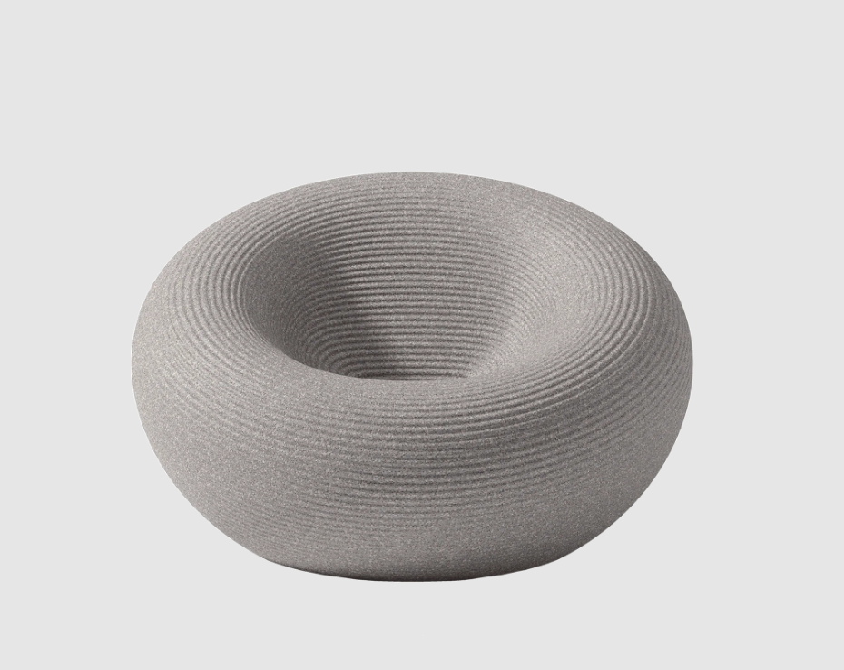Fauteuil d'extérieur de forme circulaire, avec un canal pour l'évacuation de l'eau et une surface avec des anneaux concentriques.