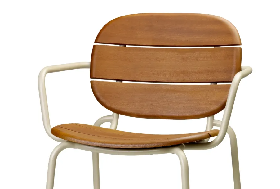 L'assise et le dossier sont réalisés en lattes de bois d'acajou massif Sapelli , spécifiquement traitées pour résister à l'utilisation en extérieur , aux intempéries et aux rayons UV.