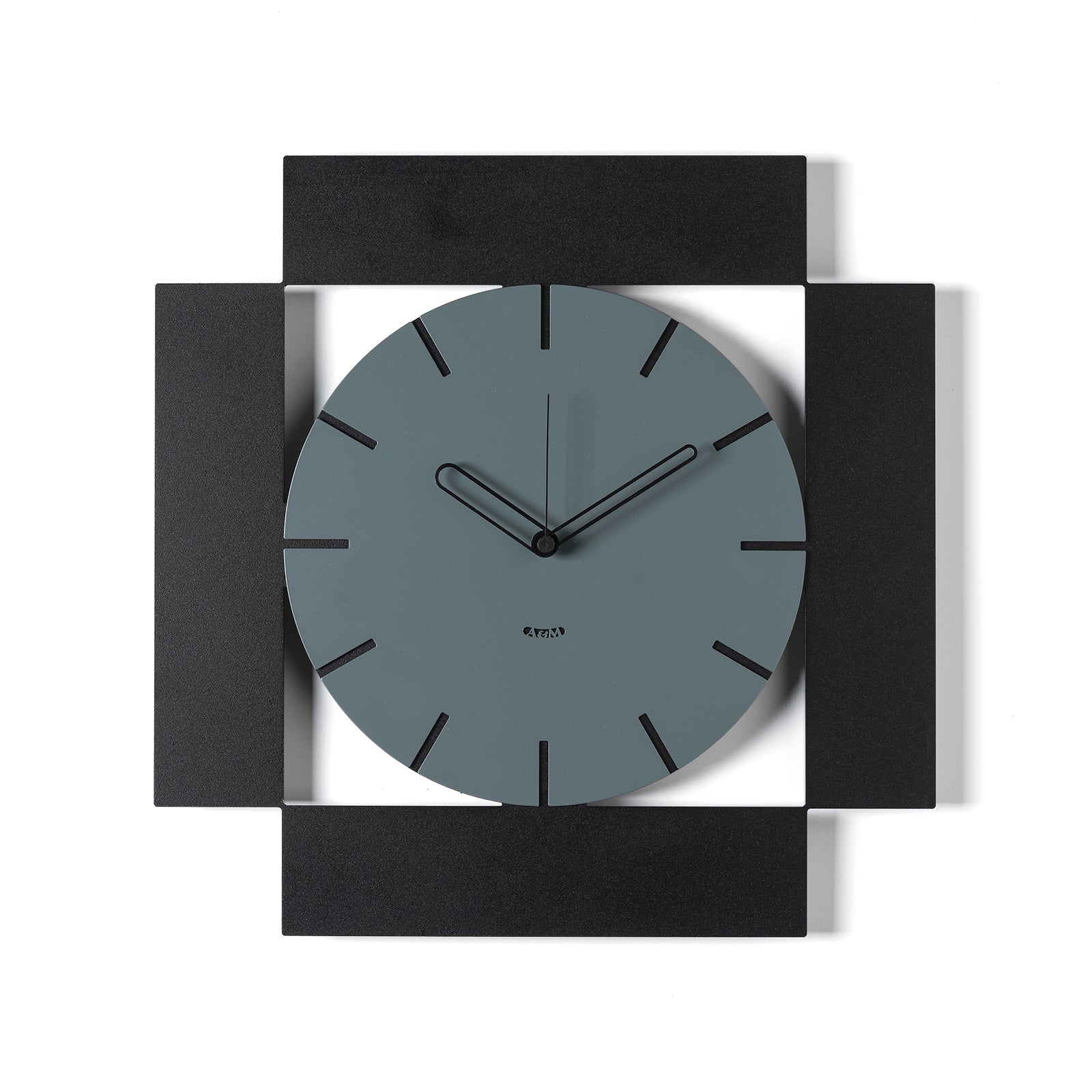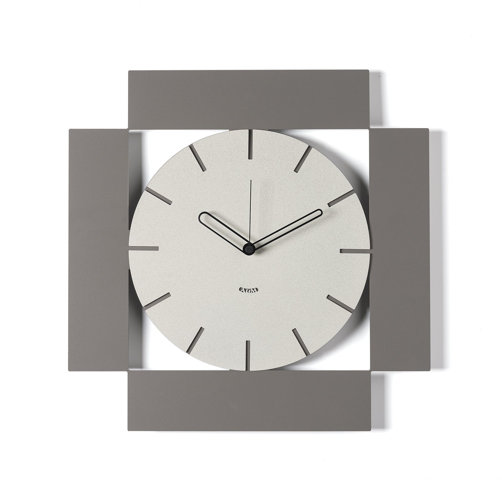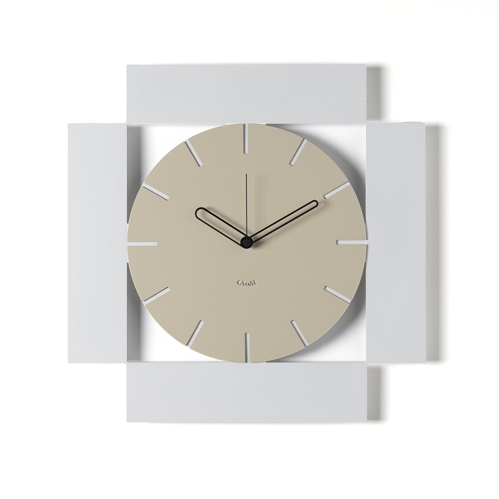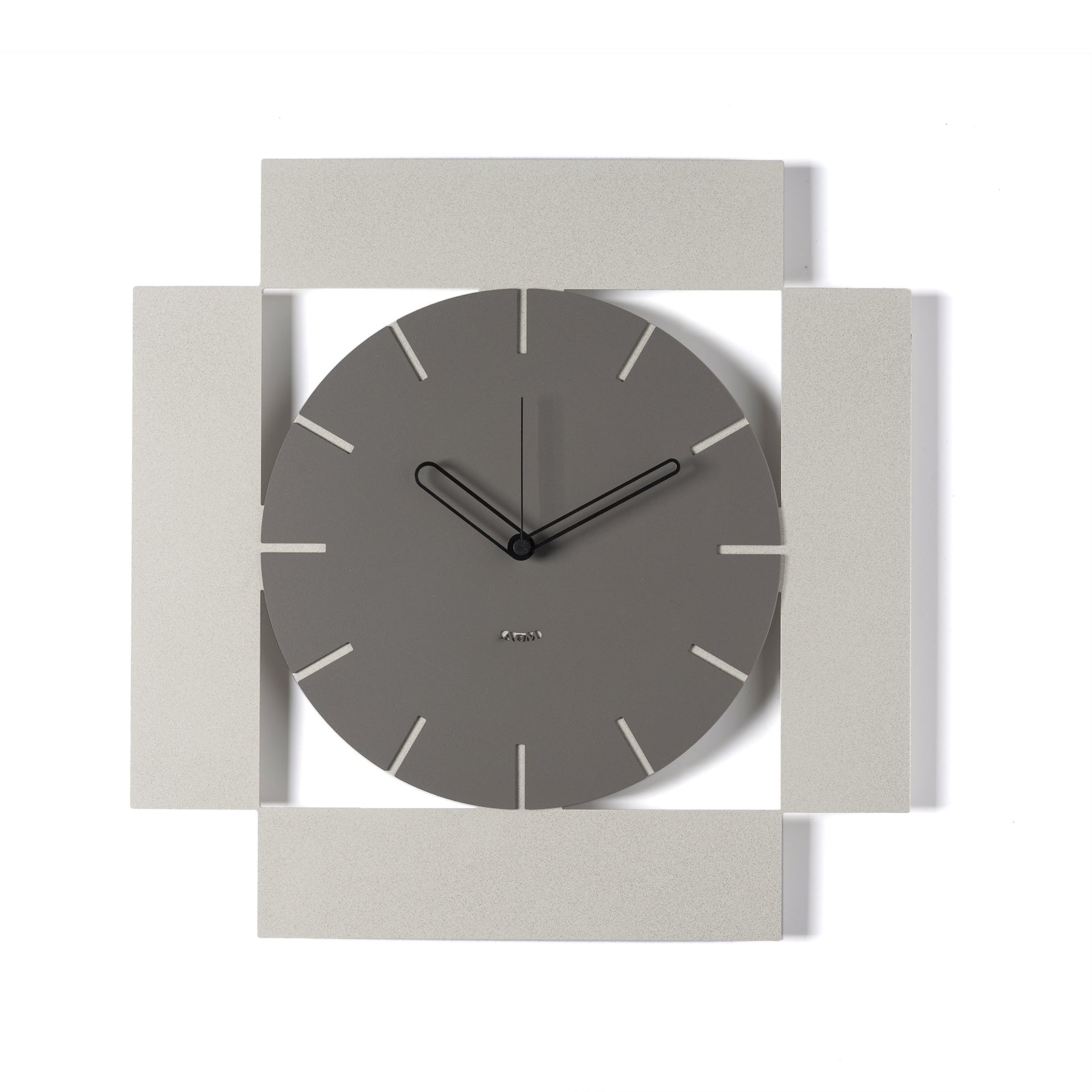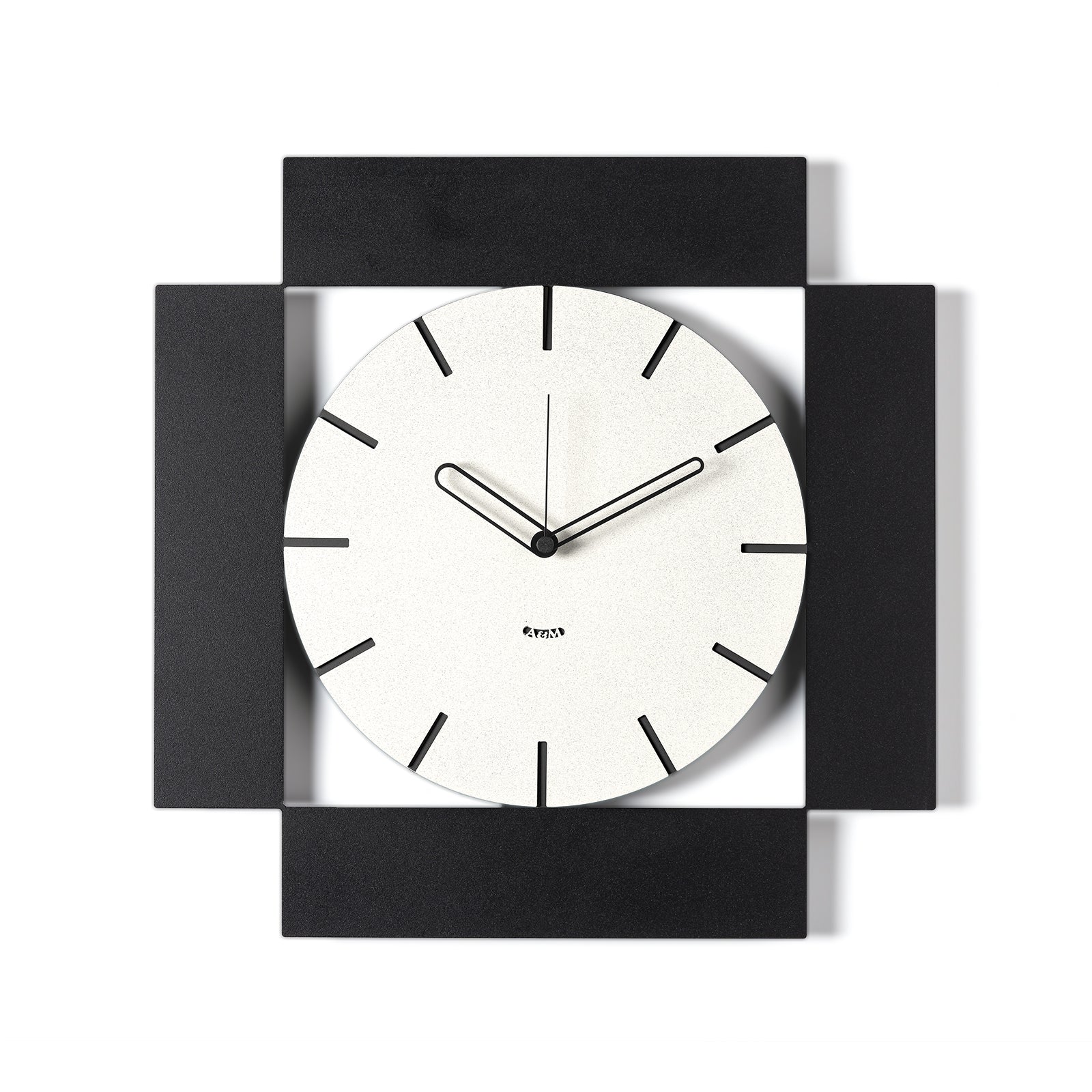 Au centre de la composition se trouve un cadran rond, simple et lisible, marqué de fines lignes indiquant le passage des heures. Ce qui rend Radical unique, c'est la structure qui l'entoure : quatre rectangles disposés en miroir sur les côtés du cadran, comme pour l'encadrer, formant un cadre carré parfaitement symétrique. Ce jeu de formes crée un effet dynamique et ordonné, idéal pour les espaces modernes et élégants.