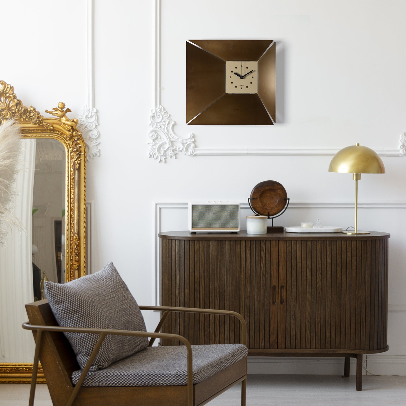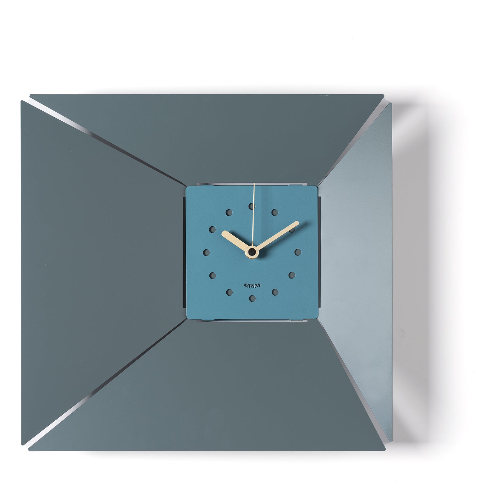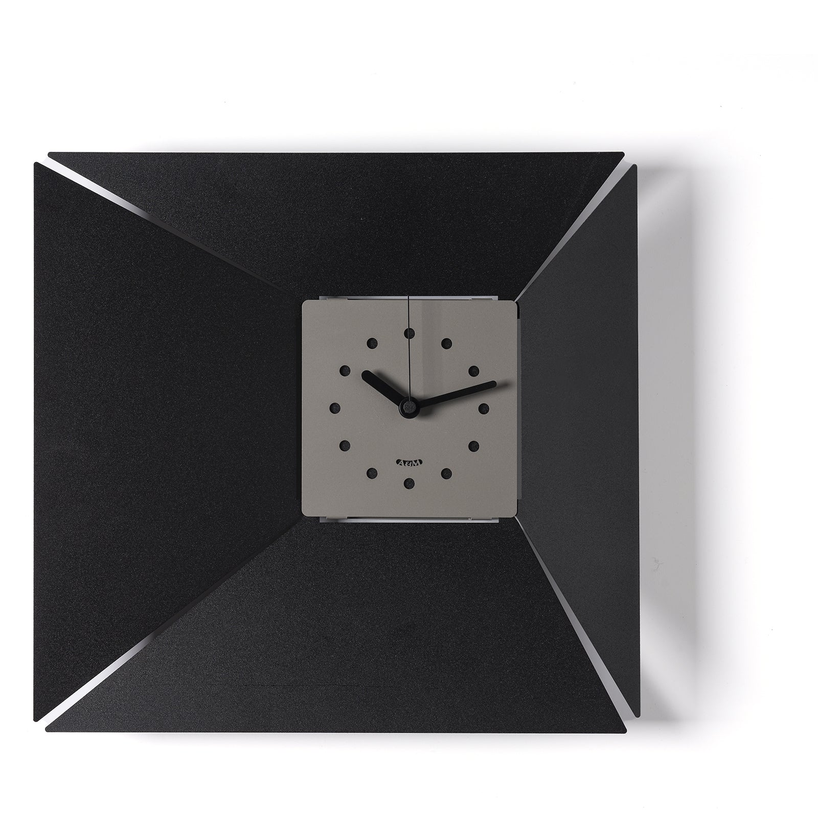La structure carrée, mesurant 42 x 5 x 40 cm de hauteur, la rend unique grâce à la finition soignée de ses angles : perforés et inclinés vers l'intérieur, ils attirent le regard vers le cadran plus petit, lui aussi carré et décentré. Ce détail crée un délicat effet de perspective, presque en entonnoir, accentué par la profondeur de 5 cm de l'ensemble. Malgré sa simplicité, le cadran est fonctionnel grâce à la présence de cercles perforés qui remplacent les chiffres et permettent une lecture claire de l'heure.