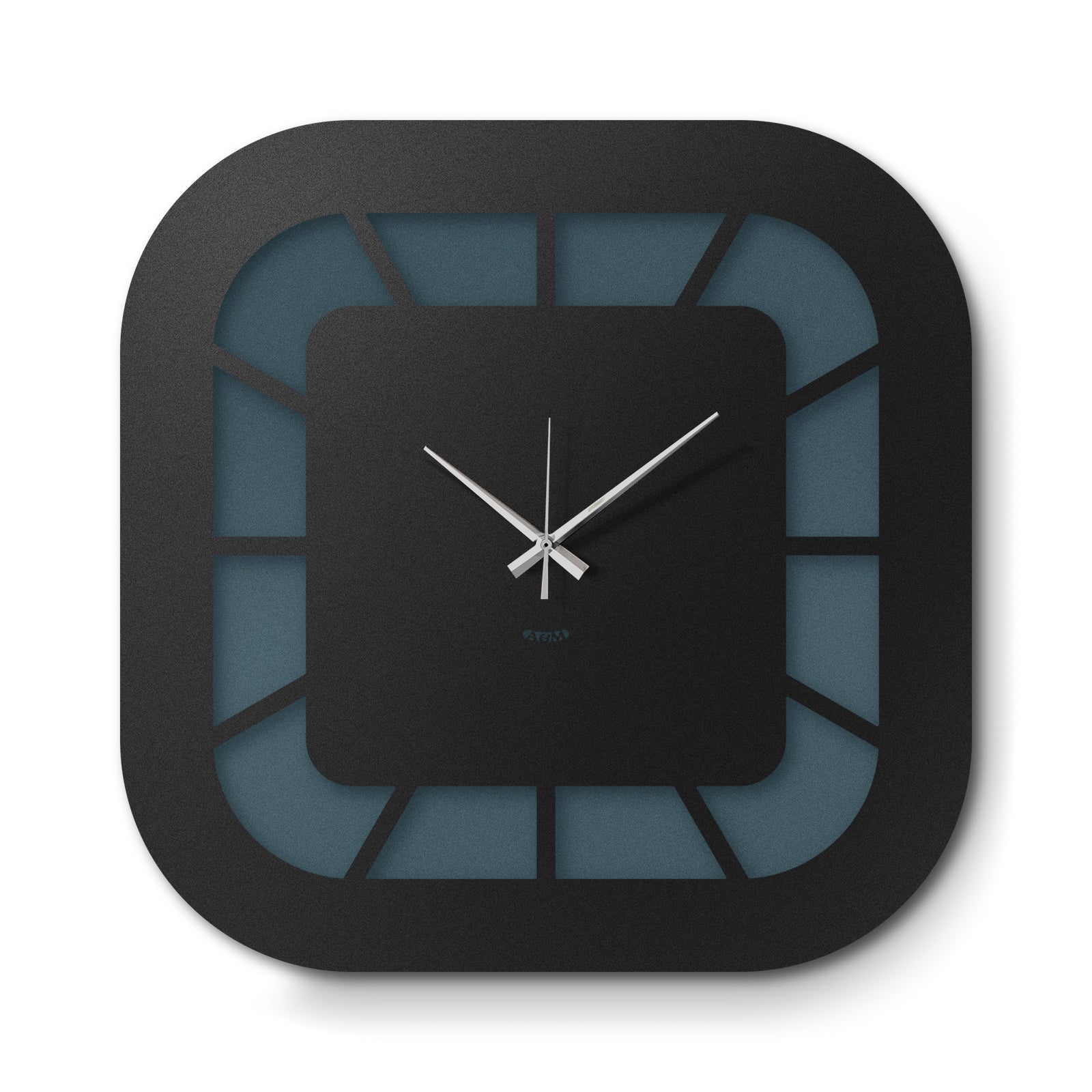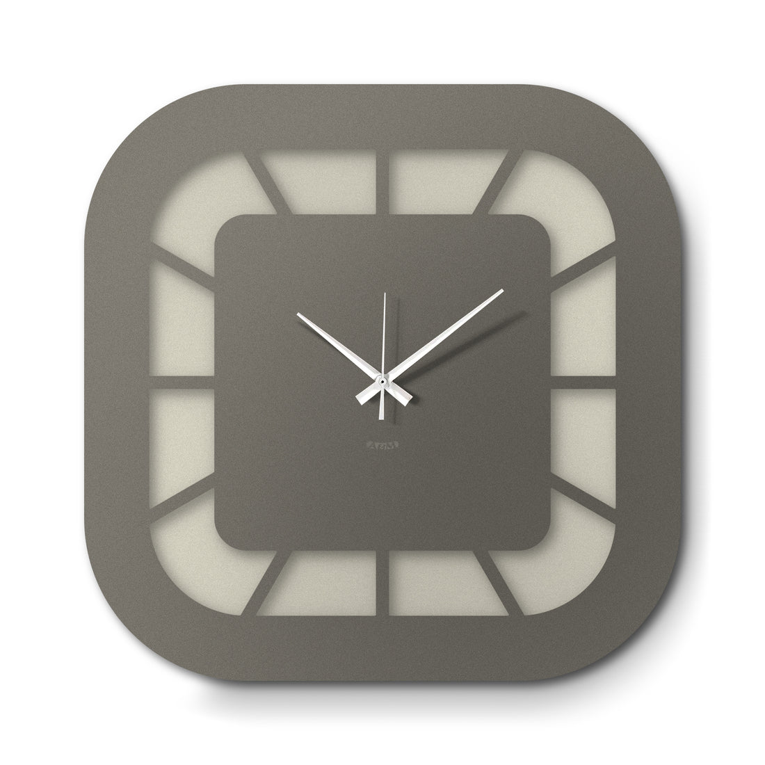 La structure de l'horloge repose sur un carré aux angles arrondis, repris sur le cadran central et le cadre extérieur. Le cadran, volontairement plus petit que la structure générale, est relié à celle-ci par de fines lignes rayonnant vers l'extérieur, créant un effet graphique épuré et léger. La partie inférieure du cadran se distingue par une couleur différente du reste, introduisant un détail visuel qui rompt la symétrie et confère du caractère à l'ensemble.