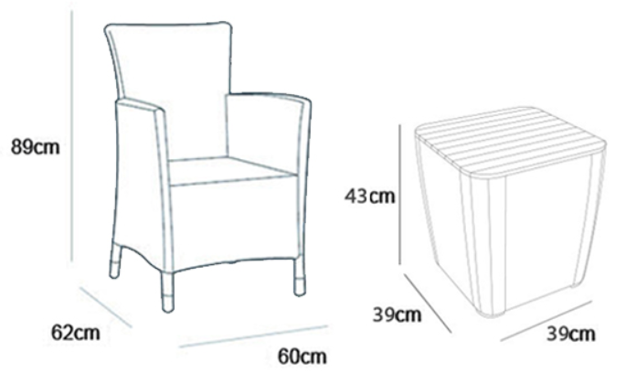 Fauteuil (chacun) : 62 cm (largeur) x 60 cm (profondeur) x 89 cm (hauteur)