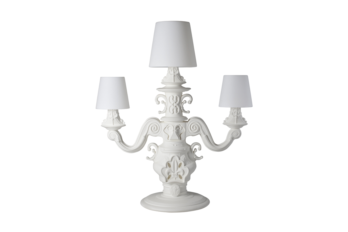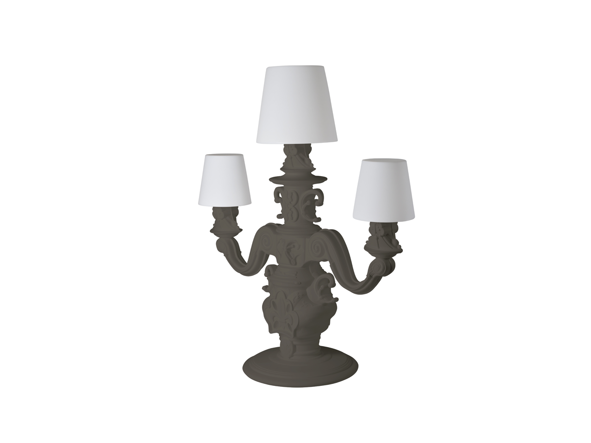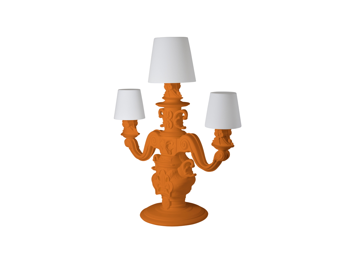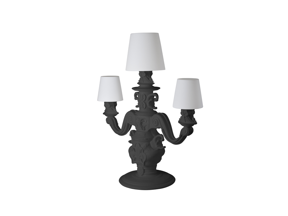 Le lampadaire King of Love est conçu par Graziano Moro et Renato Pigatti dans la collection Design of Love. La base de la lampe est de style baroque, tandis que les trois grands abat-jours blancs brillants ont une dimension majestueuse, ils offrent une particularité innovante: le polyéthylène est travaillé avec une finition de surface particulière, avec une texture de motifs classiques, pour obtenir une décoration raffinée , élégant et agréable au toucher.