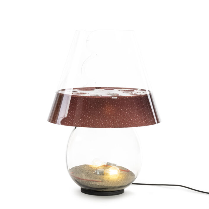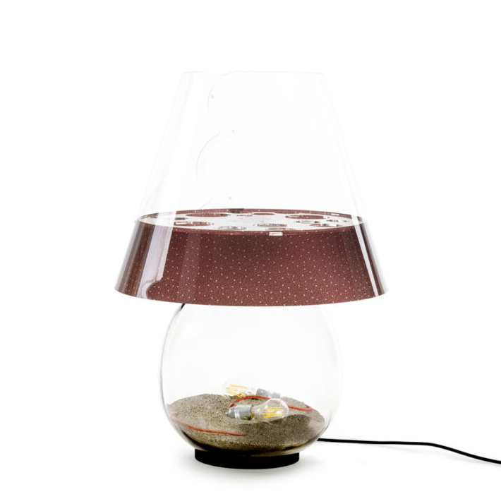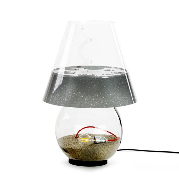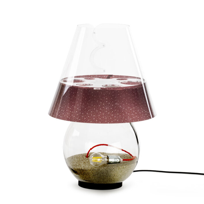 La lumière, positionnée à l'intérieur du corps de la lampe, crée un effet suggestif qui rappelle le soleil plongeant doucement dans l'eau.