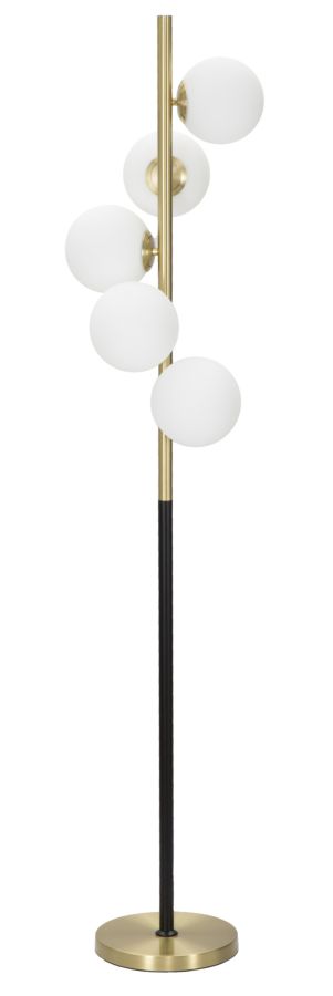 Lampadaire à 5 points lumineux en métal doré et noir avec sphères en verre blanc. Ses lignes essentielles et minimalistes s'allient à l'élégance des tons dorés et noirs pour créer une combinaison unique.| Longueur | 30 cm |
