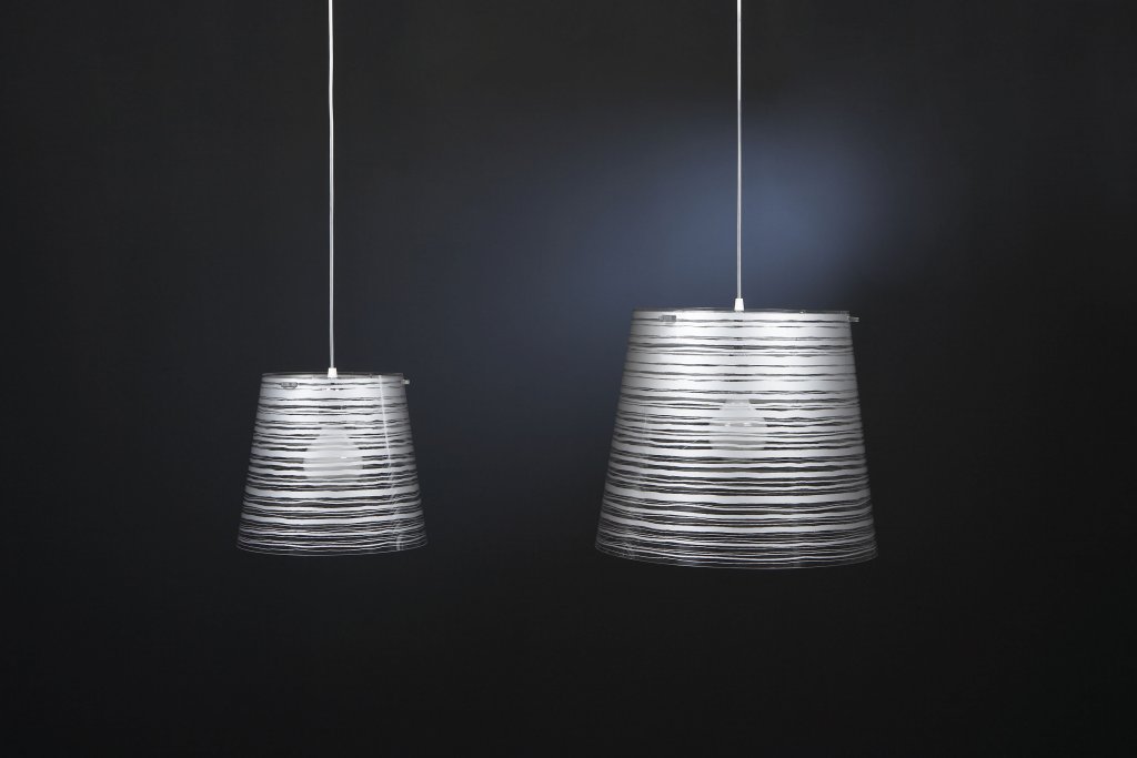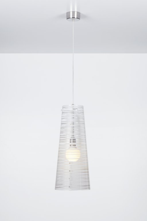 Lampe à suspension avec abat-jour conique en polycarbonate transparent et décoration en différentes couleurs, tailles et formes.