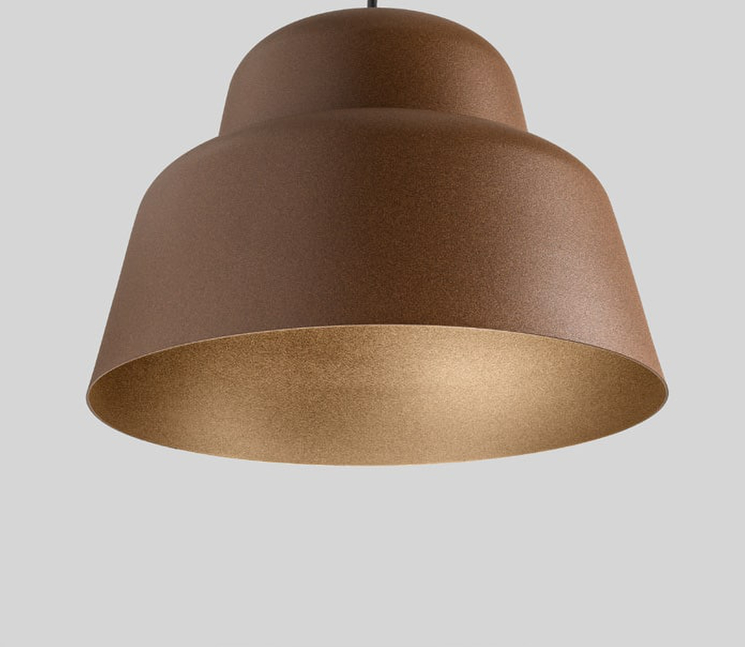 Série de lampes à suspension aux formes douces et polyvalentes, réalisées en aluminium émaillé.