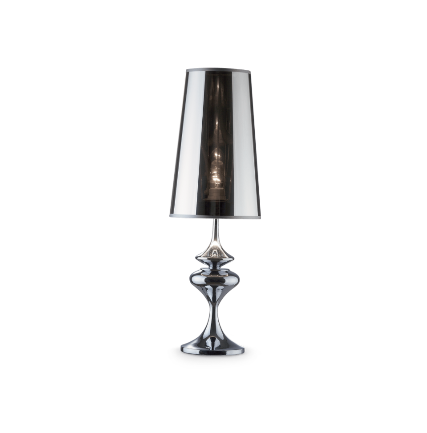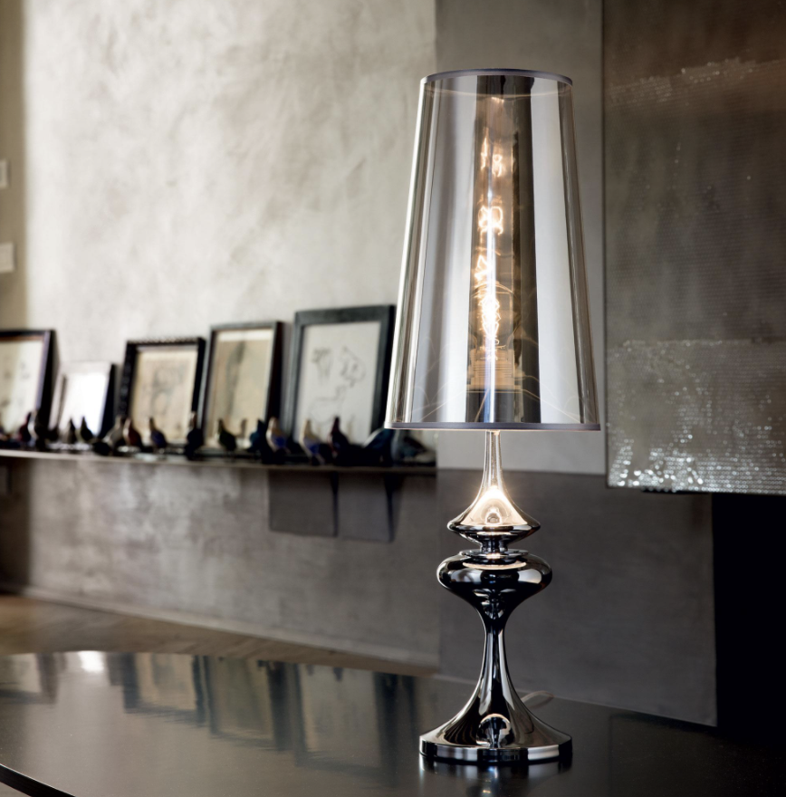 Corps léger en métal chromé. Abat-jour en film PVC de couleur chrome semi-transparent.