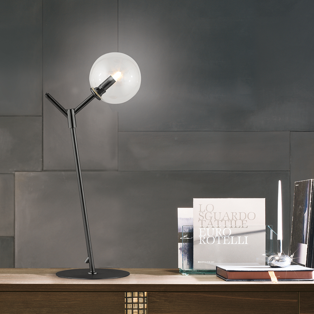 Lampe de table en structure métallique avec sphère de couvercle de lampe blanche.