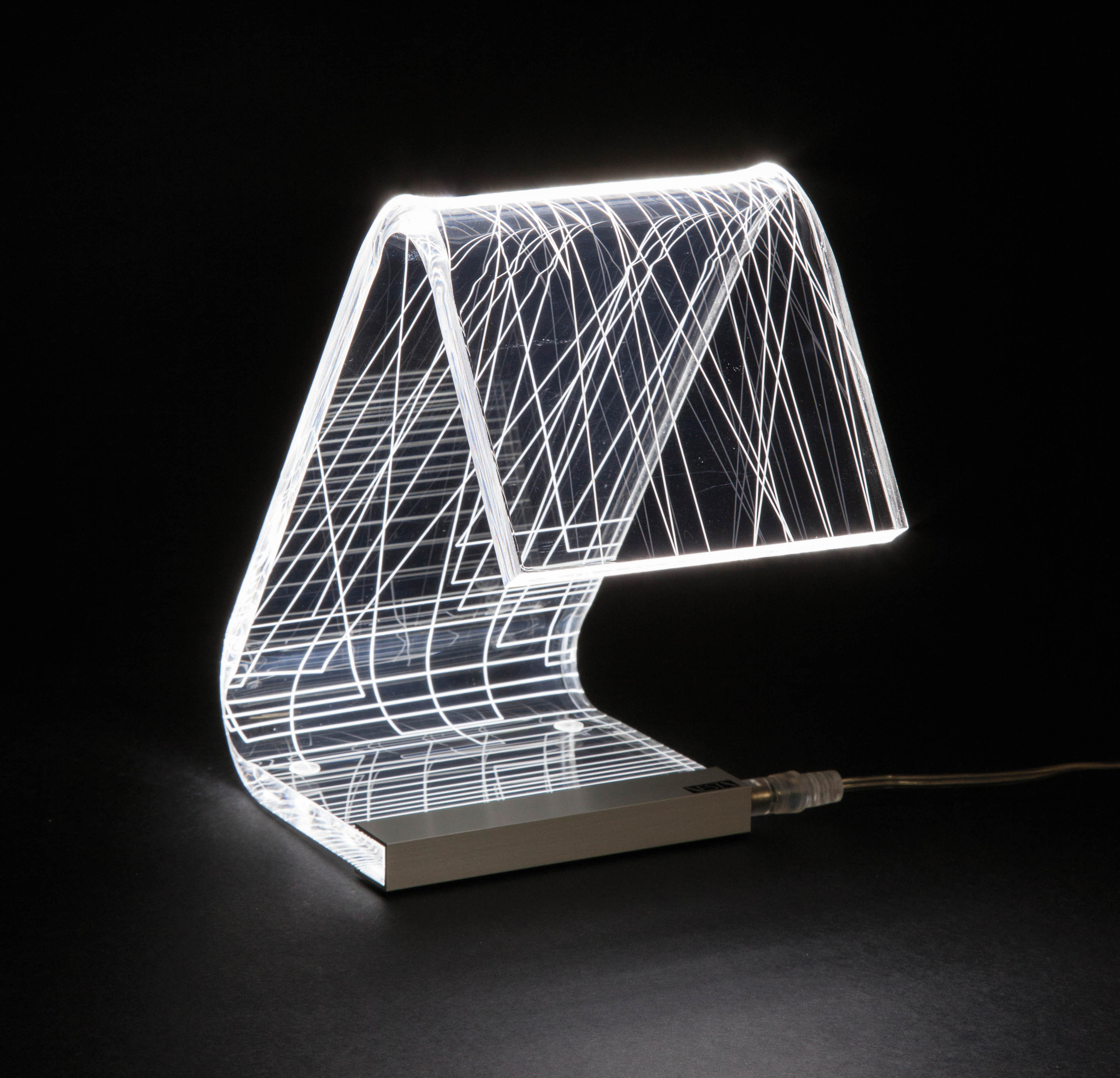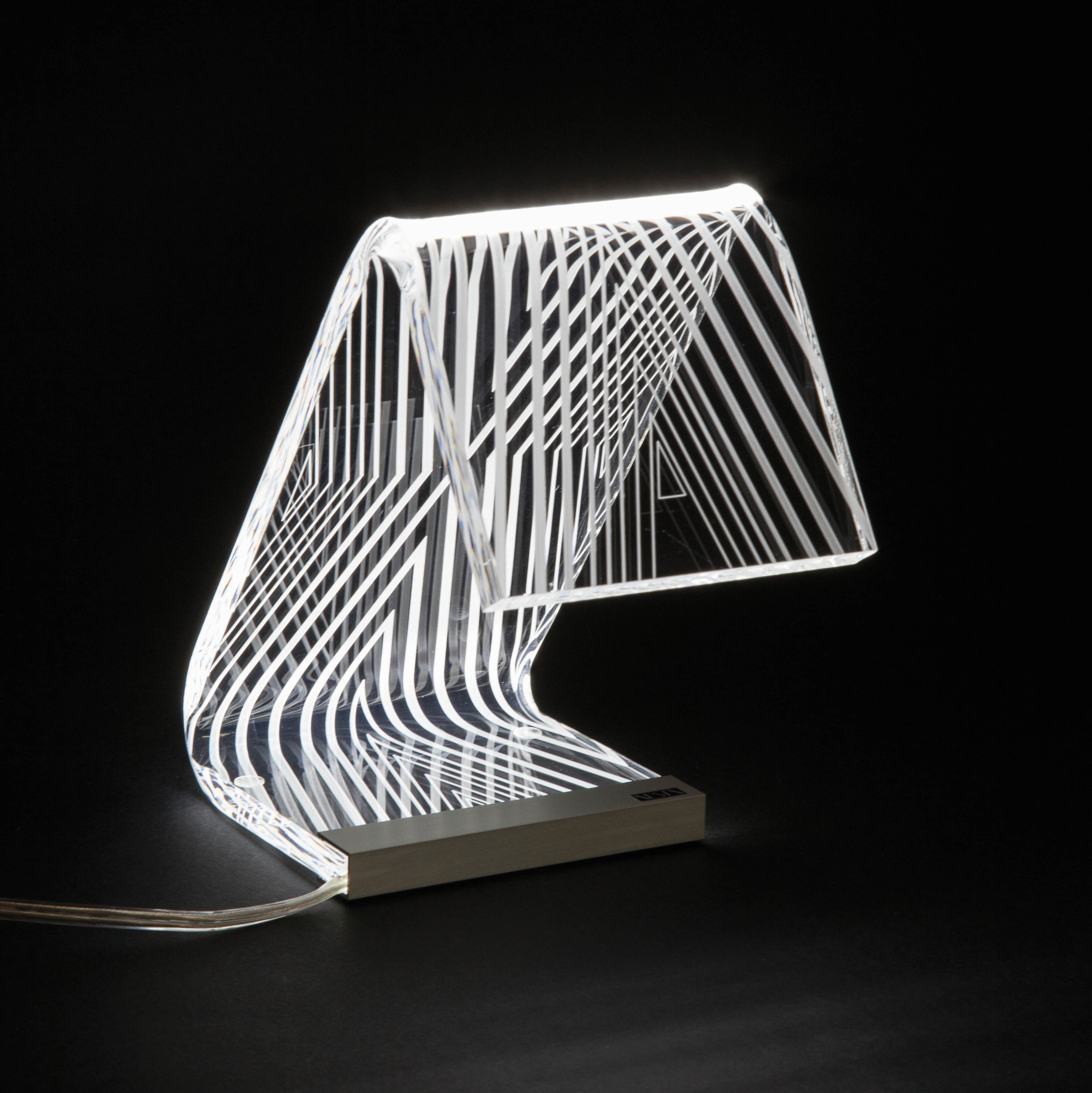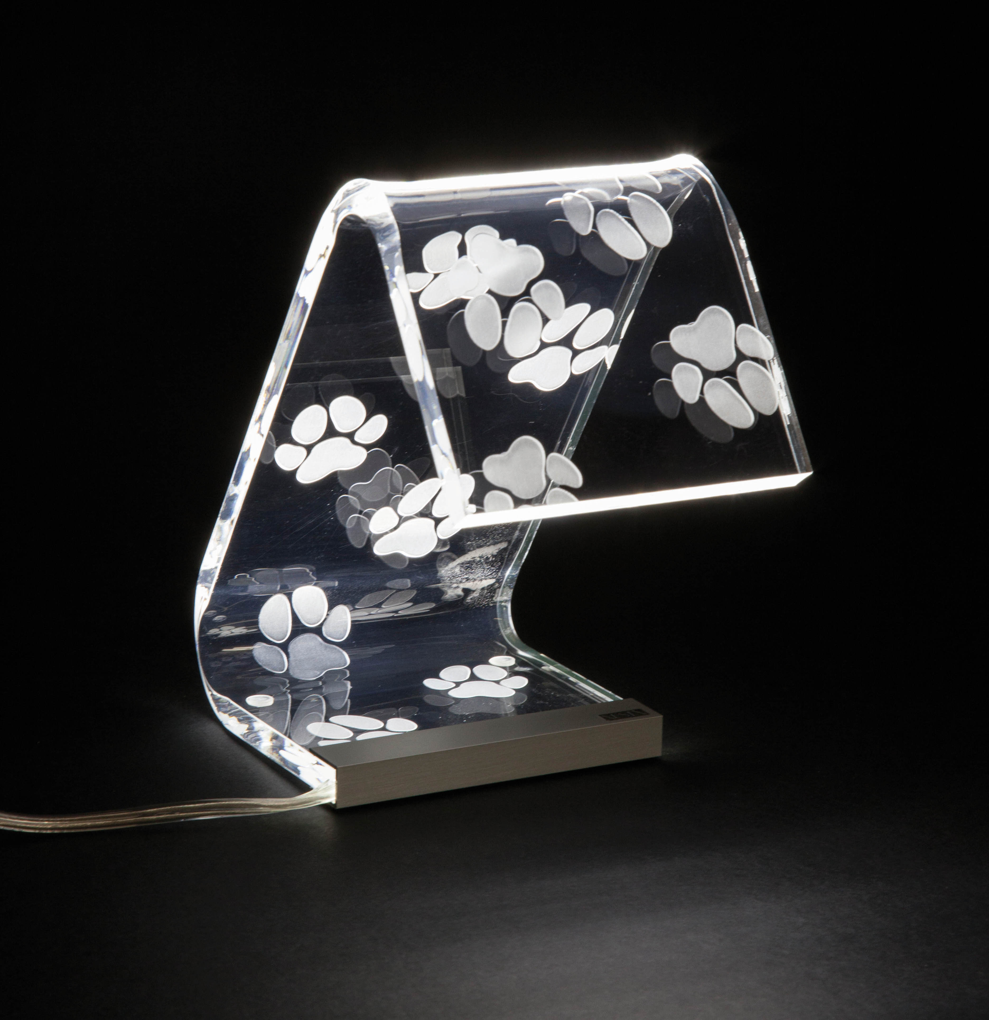 Lampe de table en cristal acrylique transparent avec décoration gravée.