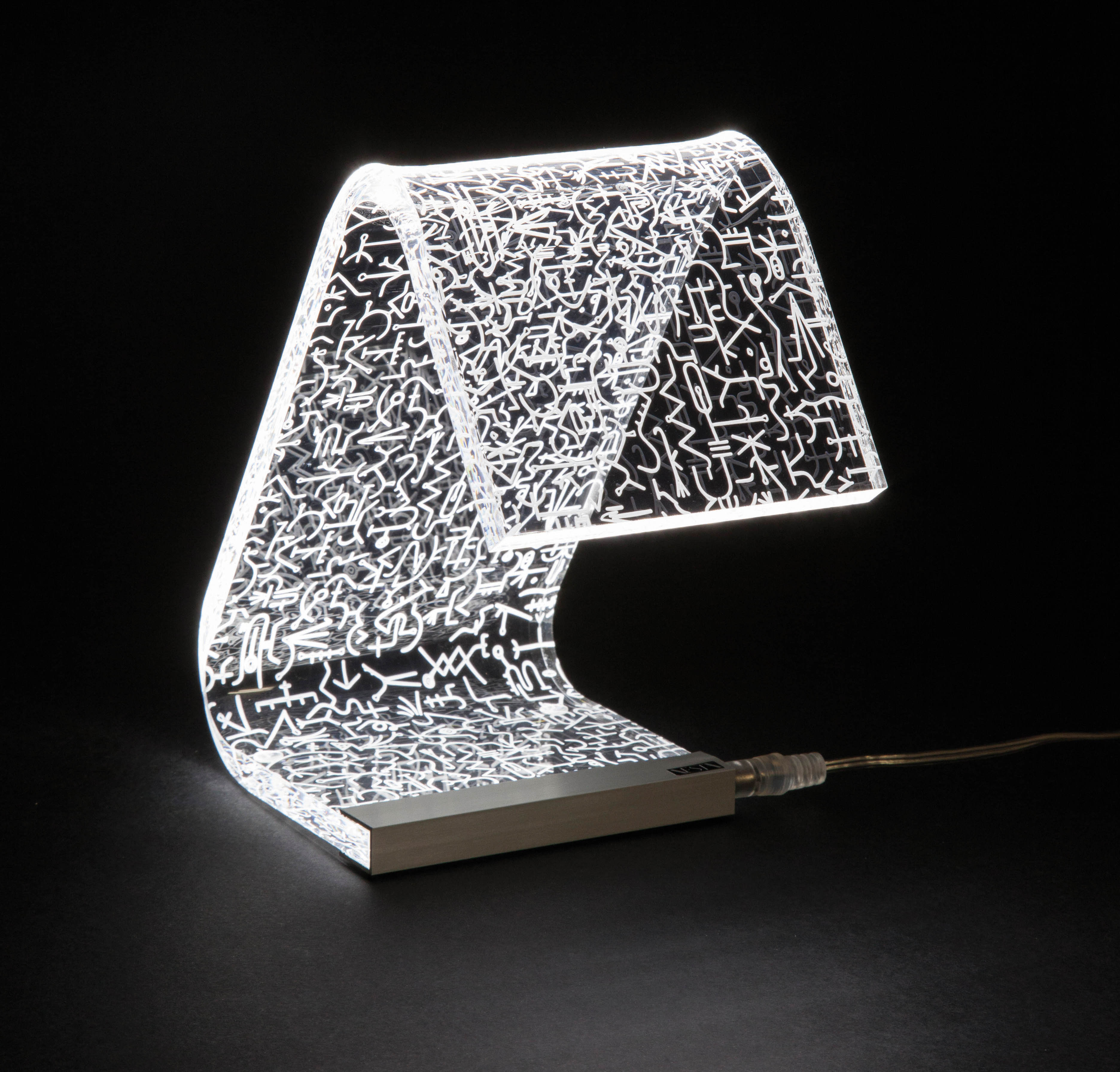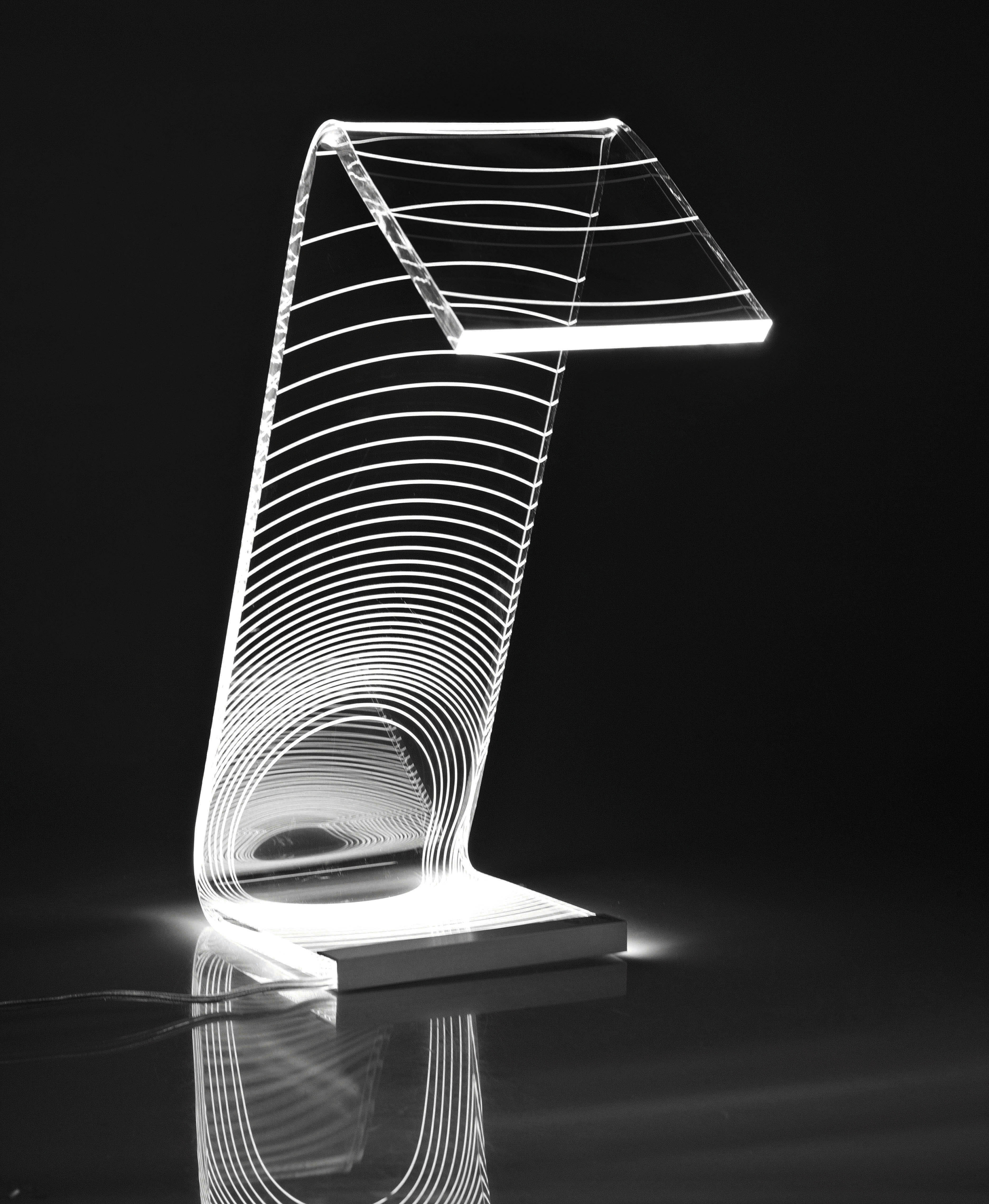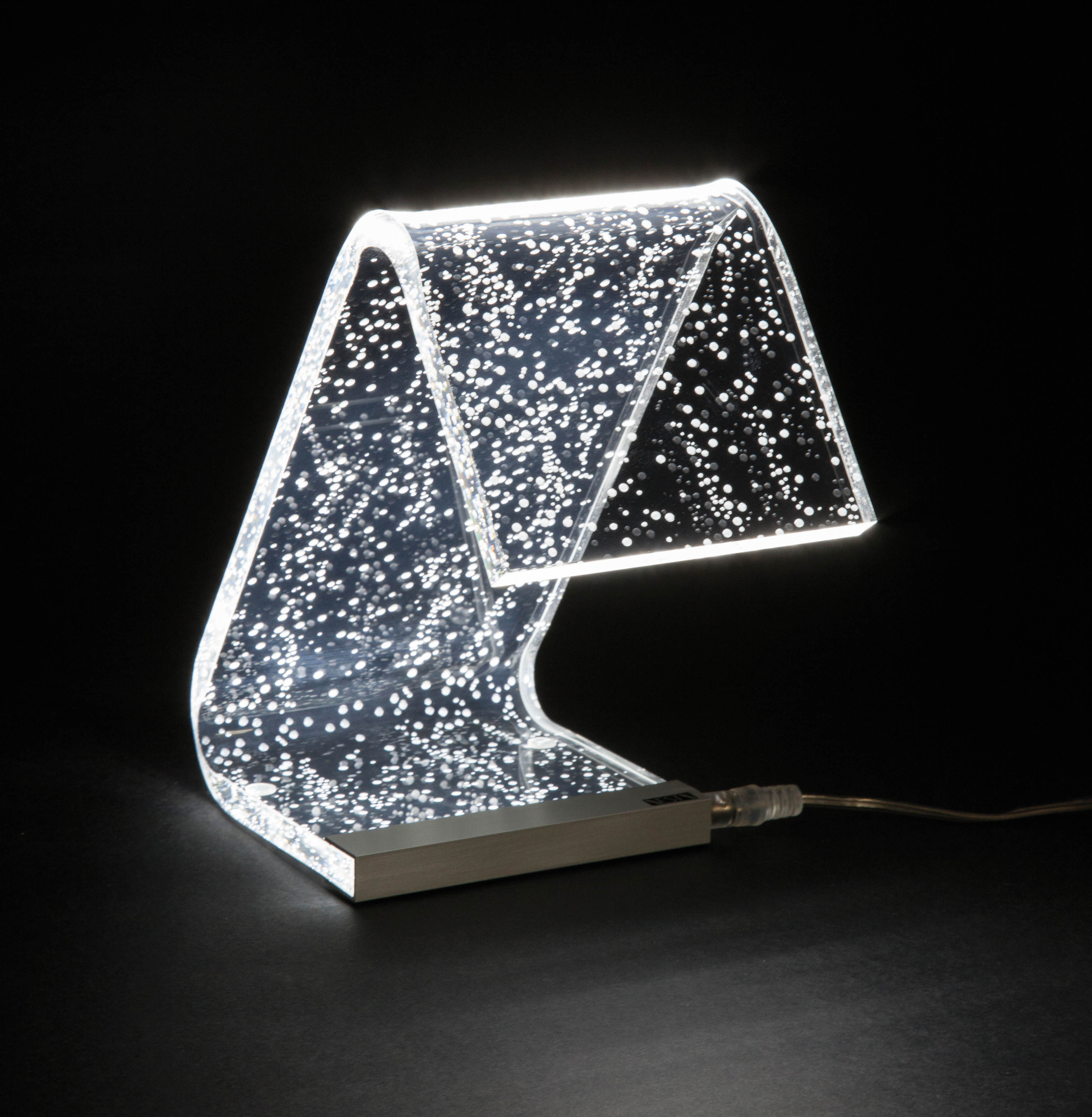 Lampe de table en cristal acrylique transparent avec décoration gravée.