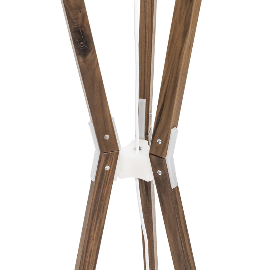 La structure en bois massif et matériel est associée à un abat-jour en polypropylène qui diffuse une lumière douce et enveloppante.