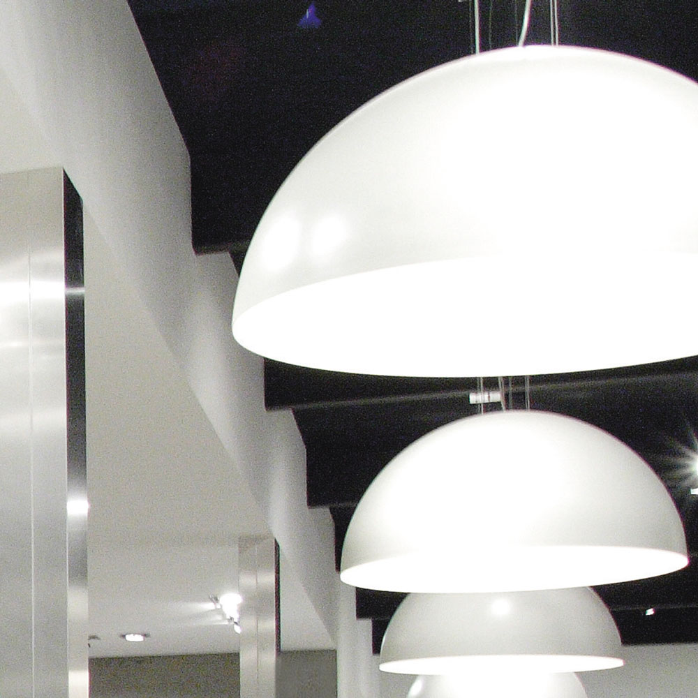 Lampe à suspension en métal. Extérieur peint en noir ou blanc mat, intérieur peint en blanc, noir, or ou argent.