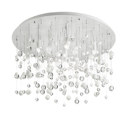 Structure en métal. Éléments décoratifs avec sphères en verre fixées à des fils de nylon. Disponible avec cadre chromé et sphères transparentes ou avec cadre blanc opaque et sphères blanches et transparentes.