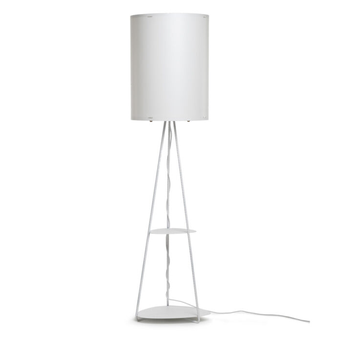 L'abat-jour est en polypropylène, tandis que la structure est en fer peint avec des étagères intégrées.