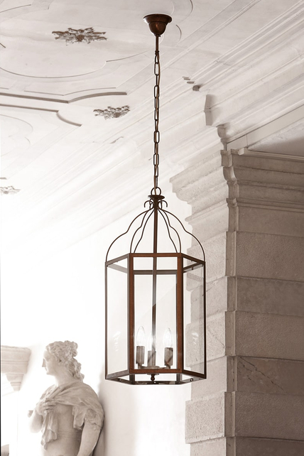 Grande lanterne suspendue de forme hexagonale avec un fort impact décoratif.