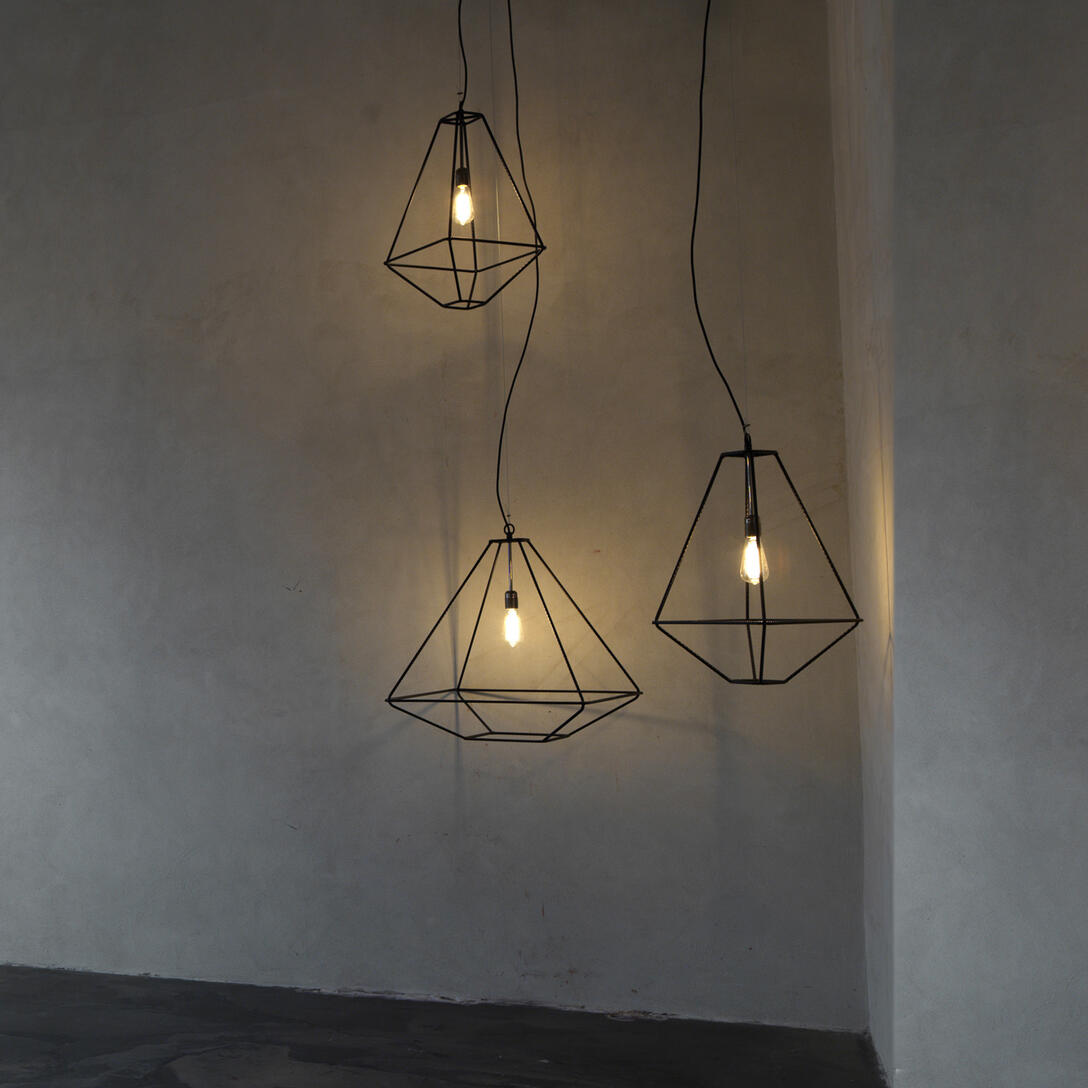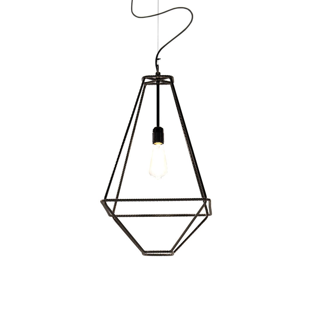Lanterne lumineuse avec structure en métal travaillé, structure filaire finition nickel noir. Transversal : à poser, mural ou suspendu. Design Sara Bernardi Finitions : noir RAL 9005.