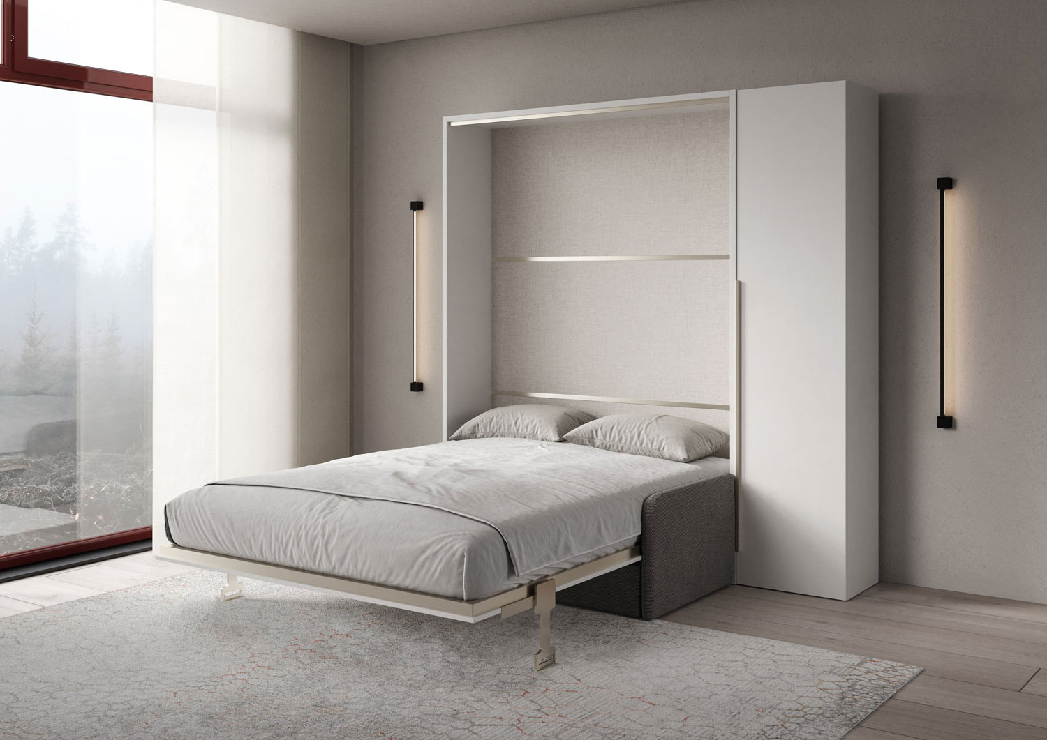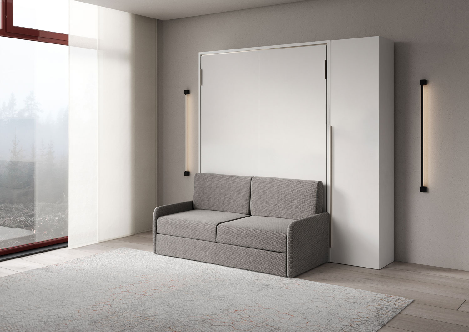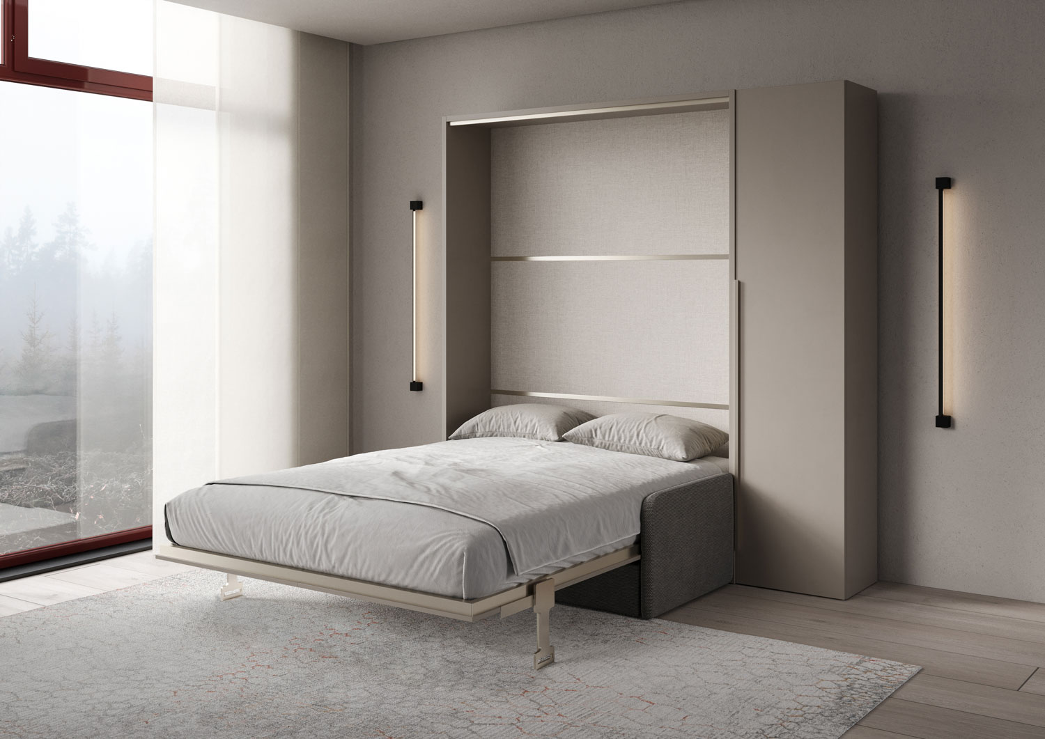 Lit double escamotable français de 140 cm, vertical, Versia Sofà, avec canapé et armoire 1 porte à droite, Argile