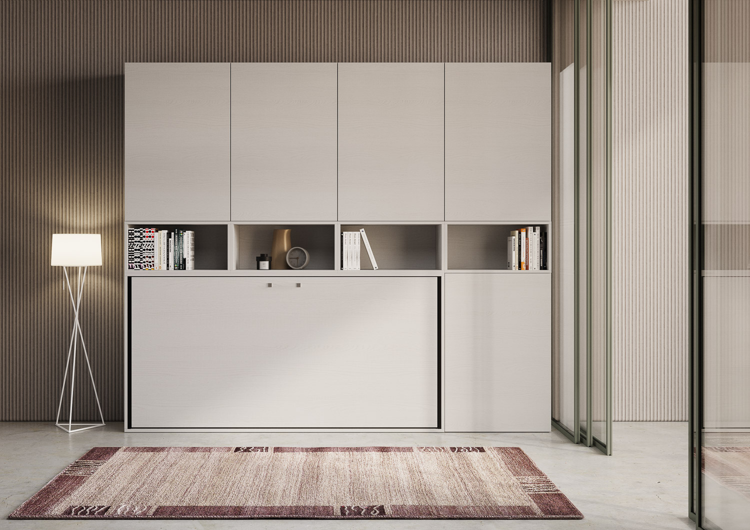 | Matériel | Kando C est un lit simple escamotable intégré dans une bibliothèque multifonctionnelle. La bibliothèque/armoire dispose de neuf compartiments de différentes tailles (cinq avec des portes, chacun avec une étagère interne, et quatre compartiments ouverts), |
