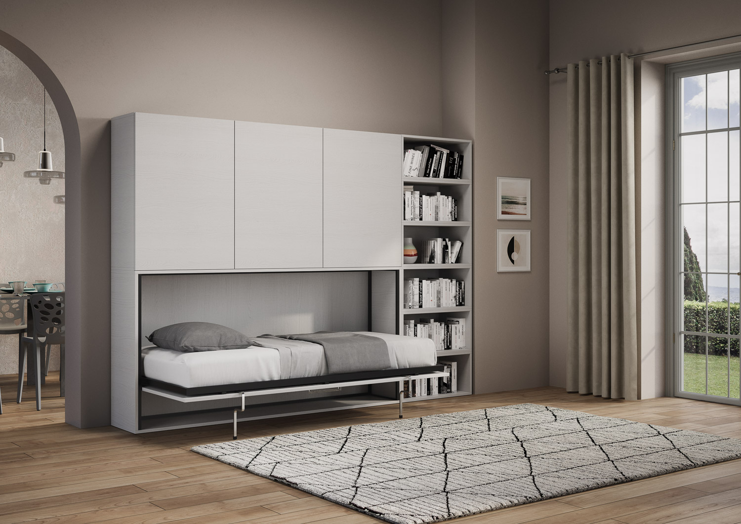 | Matériel | Kando G est un lit simple escamotable qui se transforme en une bibliothèque/armoire avec neuf compartiments (trois avec des portes et étagère interne, et six compartiments ouverts). C'est une solution originale et fonctionnelle qui permet d'optimiser l'es |