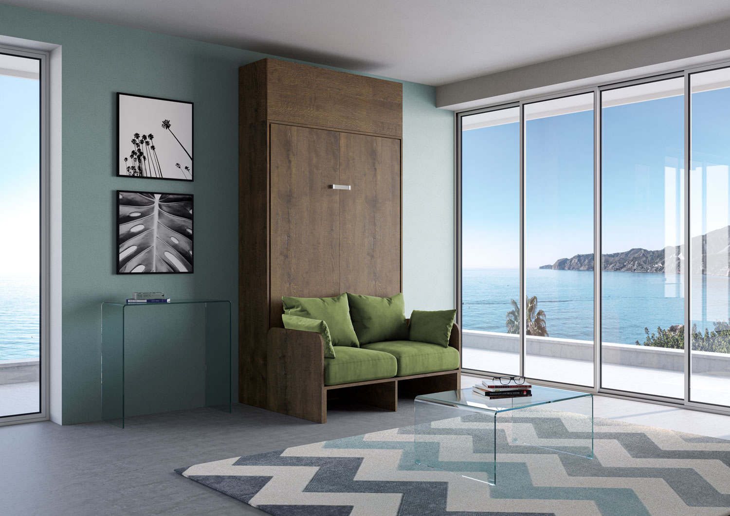 Matériel Armoire lit escamotable vertical 1 place et demi 120 KENTARO avec canapé proposé dans la version avec un élément haut horizontal avec ouverture vasistas de la ligne ISOKA. Une solution extrêmement pratique et fonctionnelle pour un zone de couchage moderne