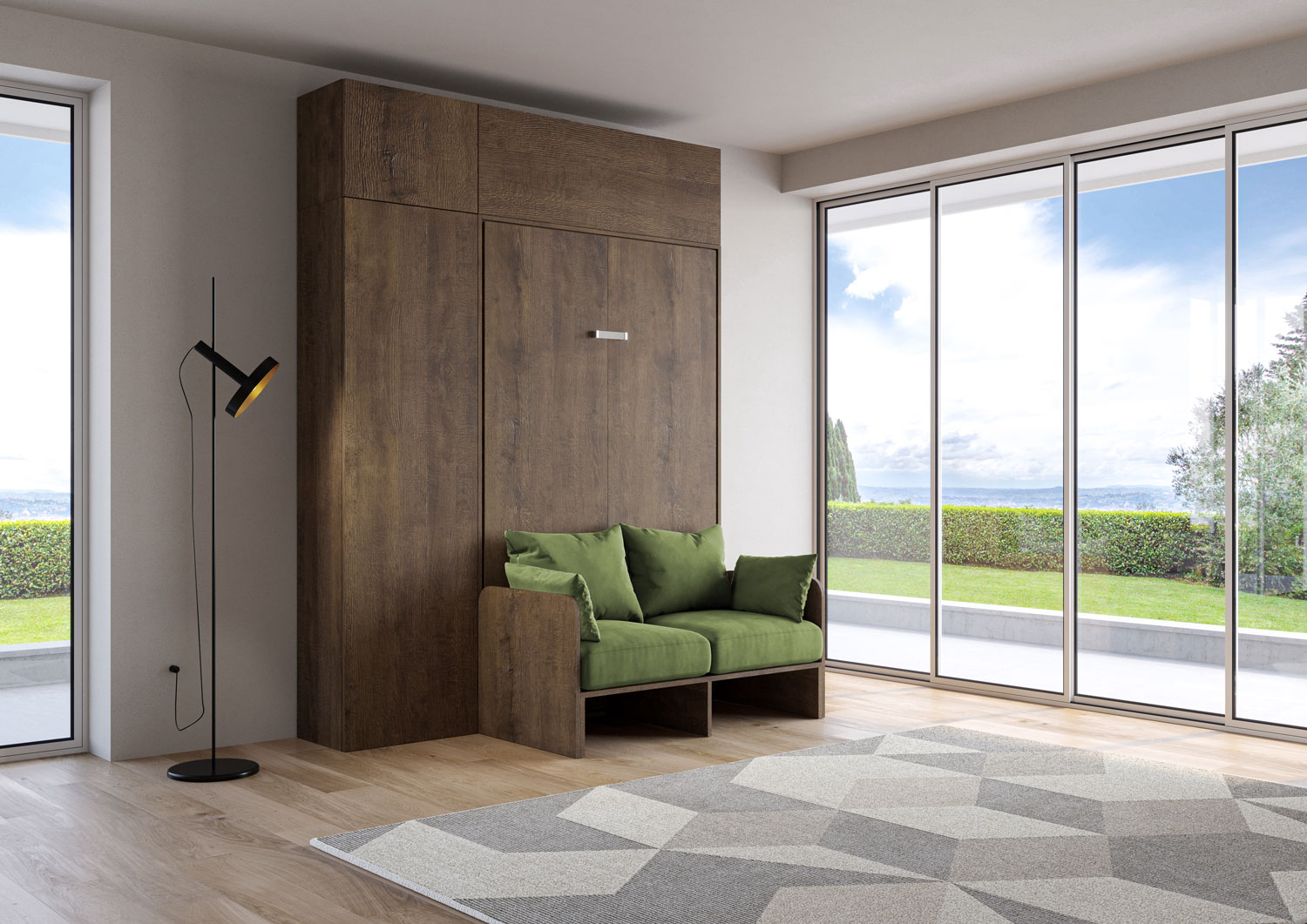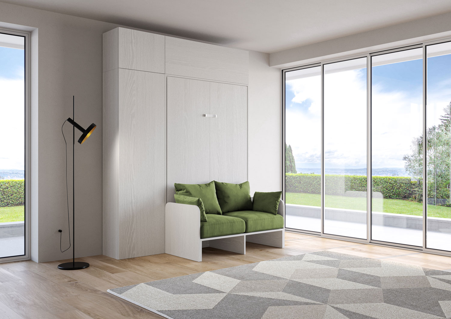 Matériel Armoire lit escamotable vertical 1 place et demi 120 KENTARO avec canapé proposé dans la version avec une colonne de rangement et deux éléments hauts horizontaux avec ouverture vasistas de la ligne ISOKA. Une solution extrêmement pratique et fonctionnelle