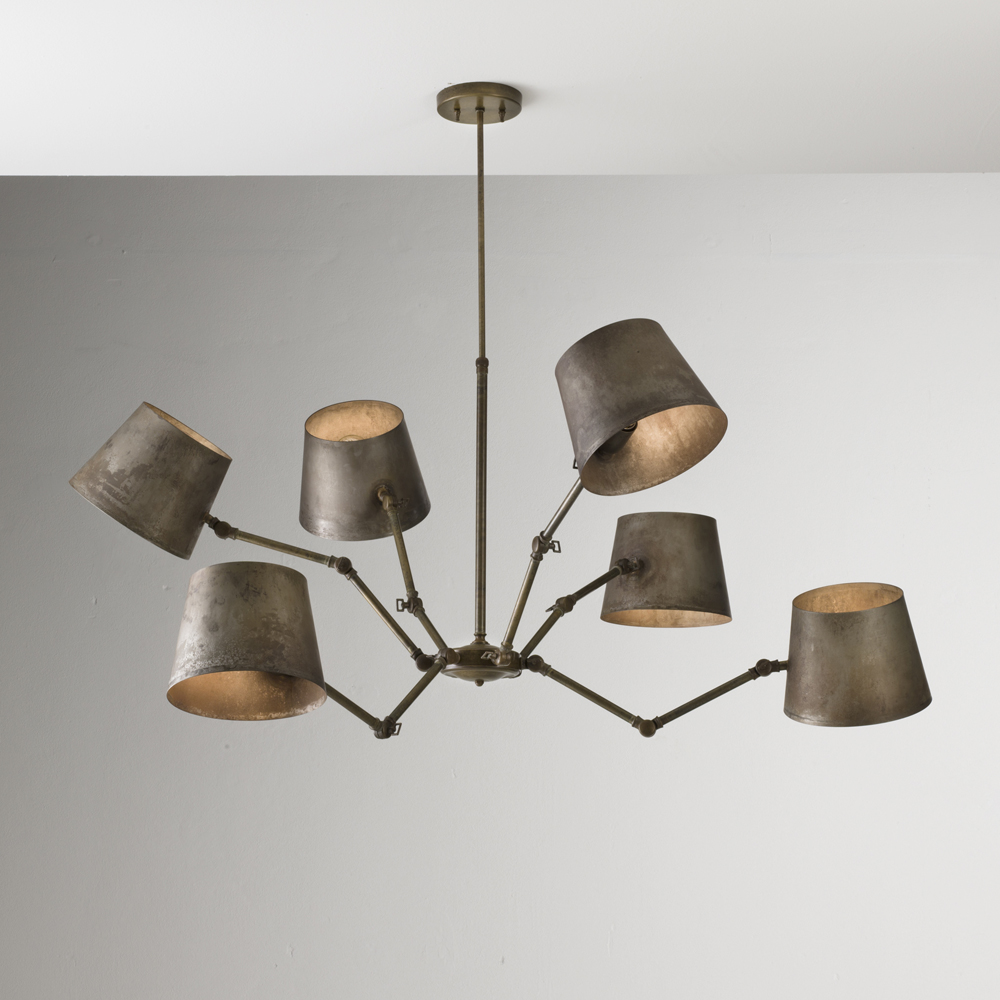 Éléments classiques et références industrielles se rencontrent dans une collection composée de suspensions, d'appliques, d'une lampe à poser et d'un lampadaire, disponibles en finition fer avec joints en fonte de laiton.
