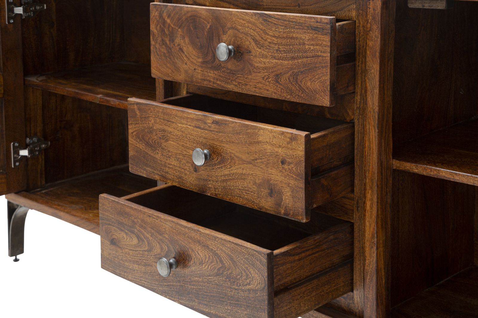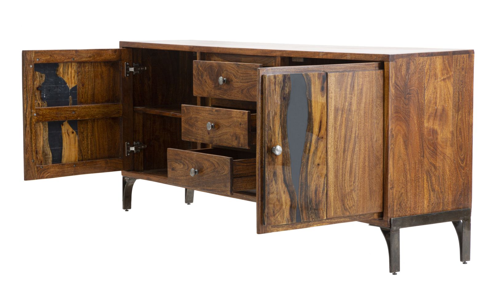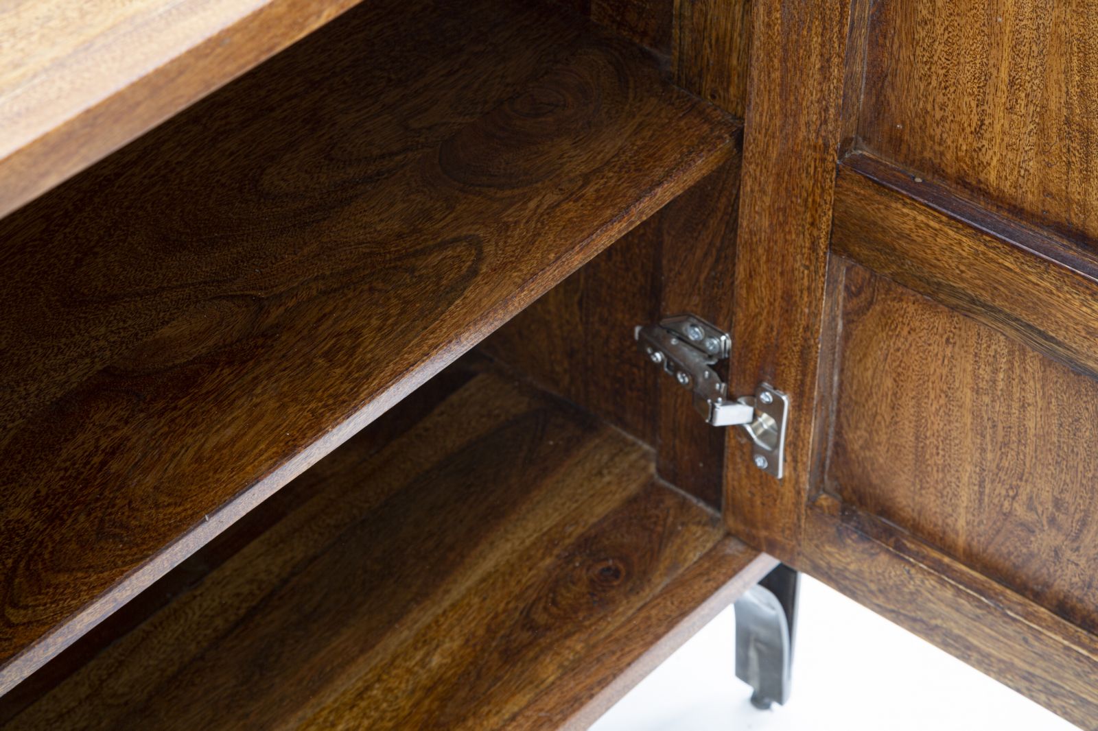 Elégante armoire en bois d'acacia massif composée de 2 portes et 2 tiroirs. Le traitement particulier avec de la résine fixée sur les portes donne une touche de couleur et de modernité à une pièce extrêmement élégante et classique.
