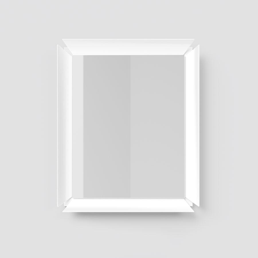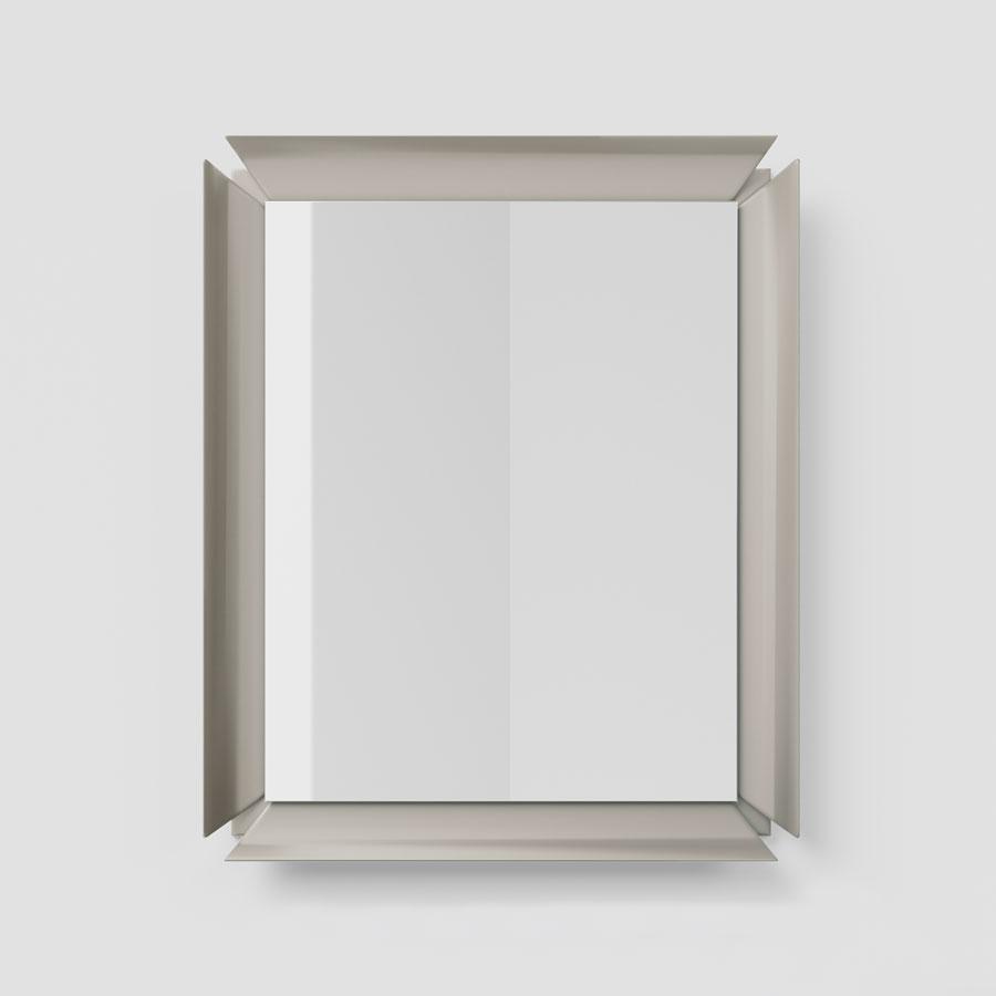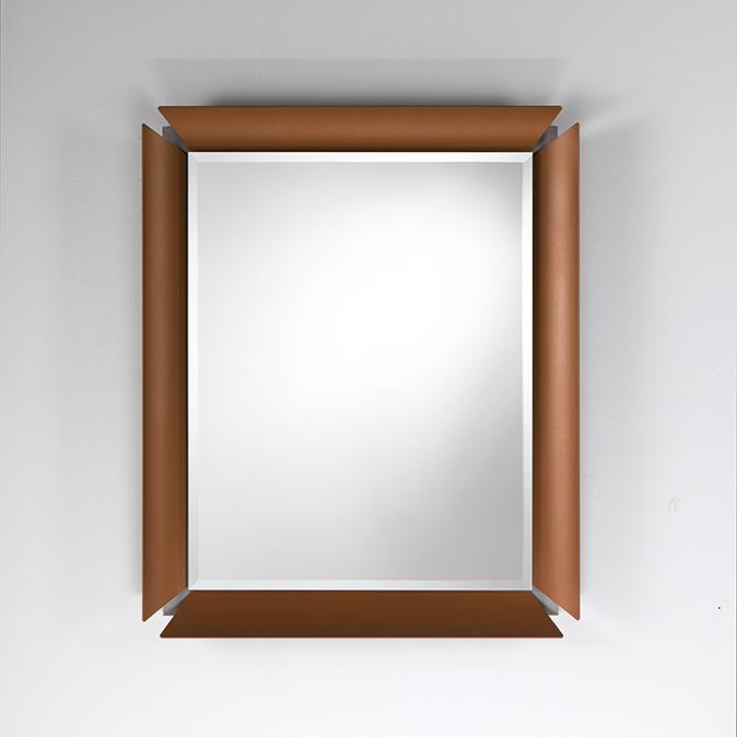 Miroir mural avec cadre en aluminium laqué mat, fixé sur un fond en stratifié coloré.