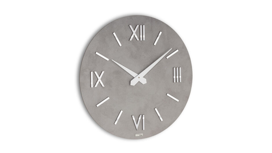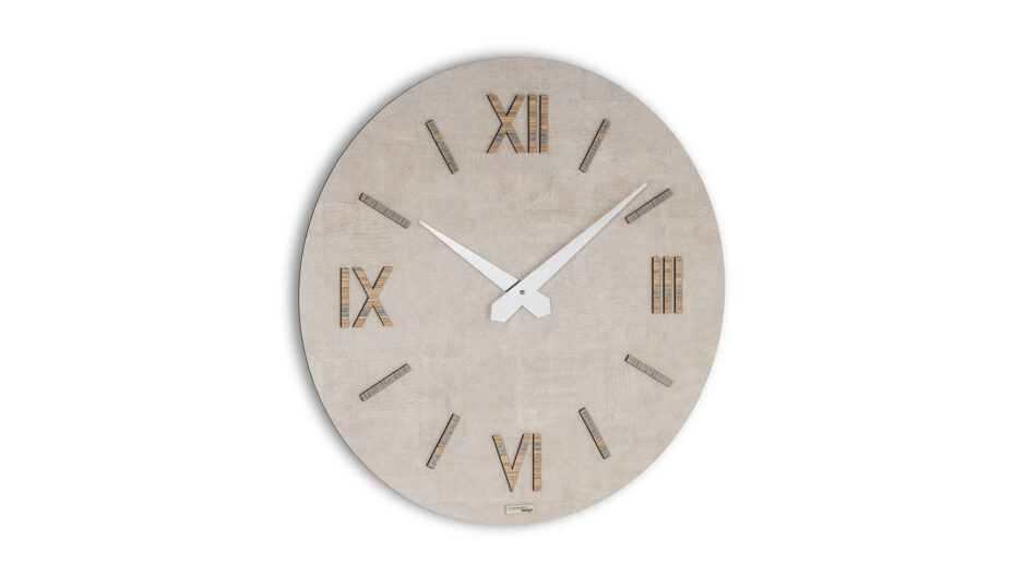 Le support est en MDF couplé à des films en polypropylène avec différentes textures qui créent de nouveaux contrastes avec des nuances uniques et design. L'incrustation des chiffres sur le cadran est le fruit d'un savoir-faire artisanal, tandis que la découpe du support et des chiffres est obtenue avec des outils de haute technologie.