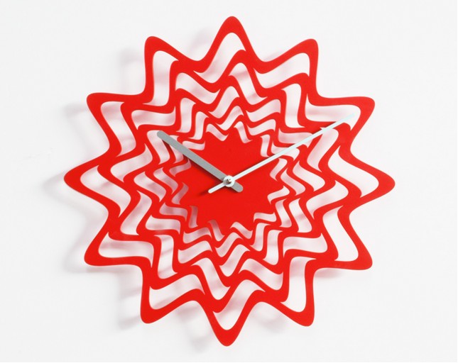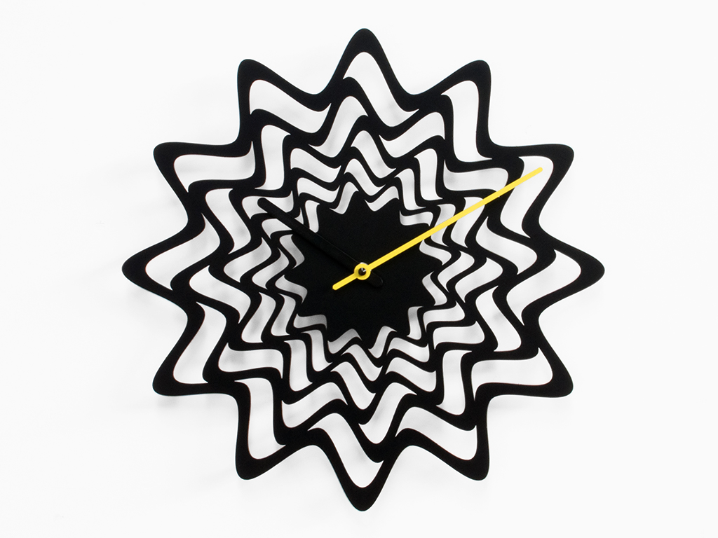 Horloge murale en métal peint. Mouvement à quartz à pile.
