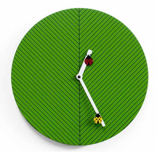 Ronde, discrète, colorée et amusante, c'est Time2bugs l'horloge murale qui fait la joie des chambres des plus petits. Sur le cadran, il y a un graphique avec de fines lignes noires qui rappellent les nervures d'une feuille sur laquelle reposent deux coccinelles en mouvement, l'une jaune et l'autre rouge. La structure est en bois. Mouvement à quartz à pile.