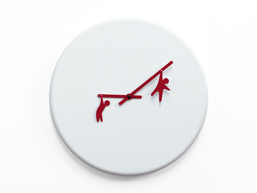L'horloge démontre le désir d'interpréter le passage du temps d'une manière ironique et ludique, apportant un peu de joie à tout moment de la journée. Les petits hommes accrochés aux mains montrent leur spectacle de trapézistes de cirque. En bois. Mouvement à quartz à pile.