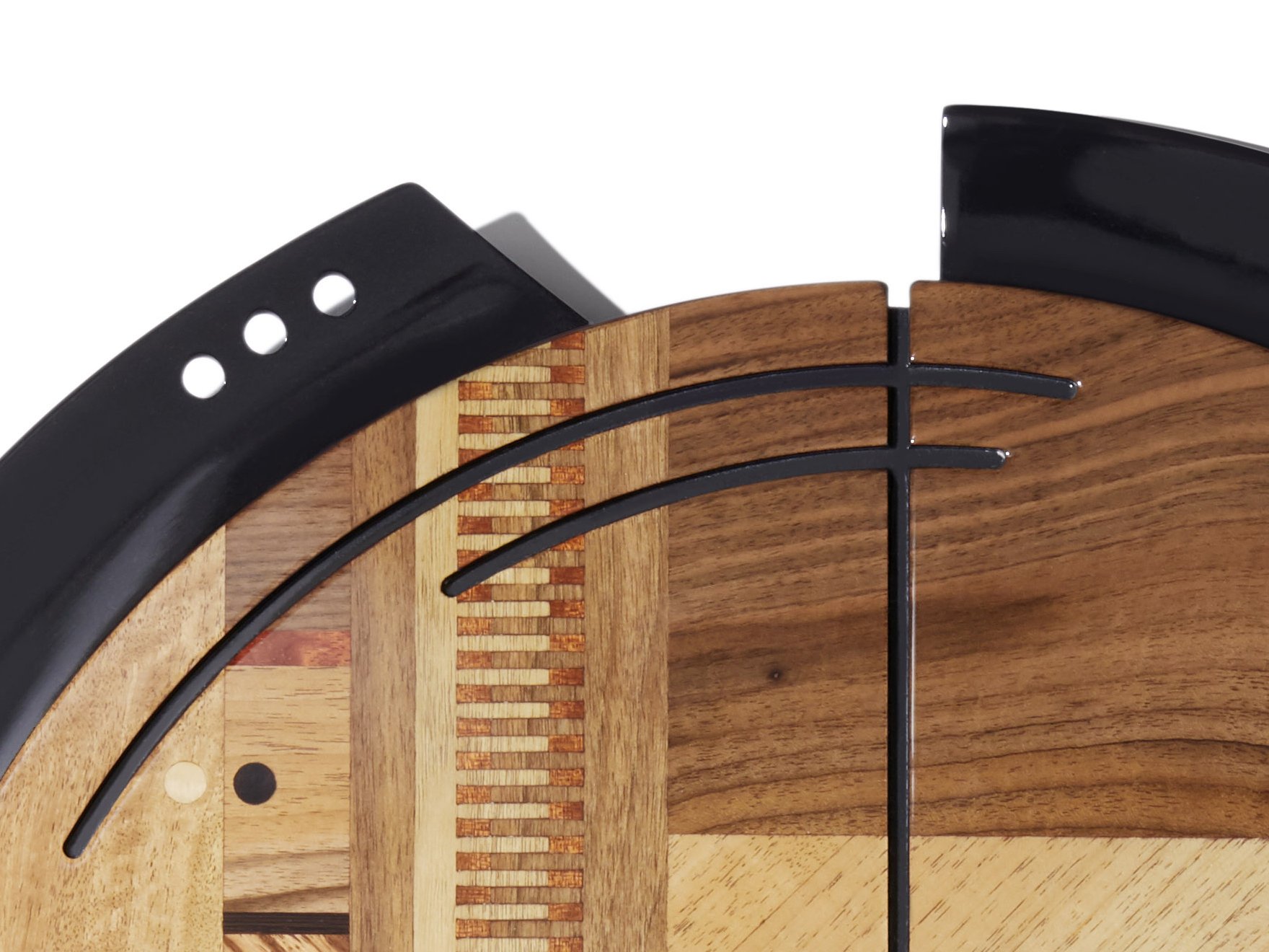La surface externe est incrustée de diverses essences précieuses, telles que la bruyère d'orme, le bois de rose, le bobinga rouge, le noyer italien, le zebrano, la bruyère de noyer. La finition de surface est brillante brillante. La structure interne est en pulpe de bois.