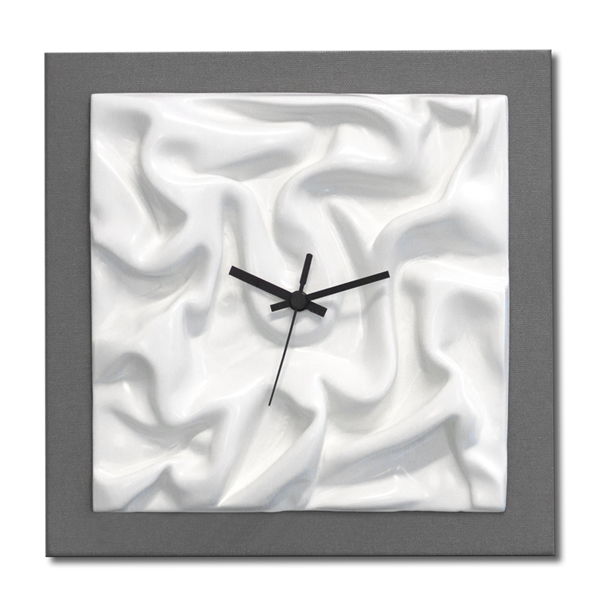 Pendule bas-relief cm 30x30 laqué blanc ivoire sur châssis en toile laquée gris quartz, aiguilles noires.
