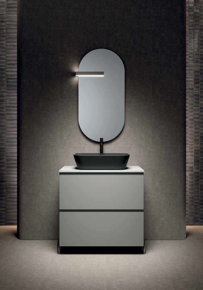 Le lavabo intégré , en harmonie avec le design linéaire du meuble, équilibre l'espace. Le miroir coordonné , également disponible avec éclairage LED, apporte une touche de modernité et améliore la luminosité de la salle de bains.