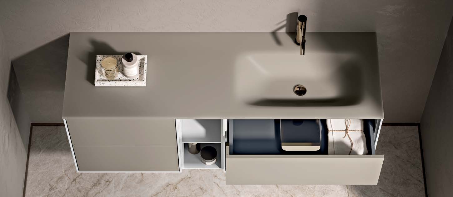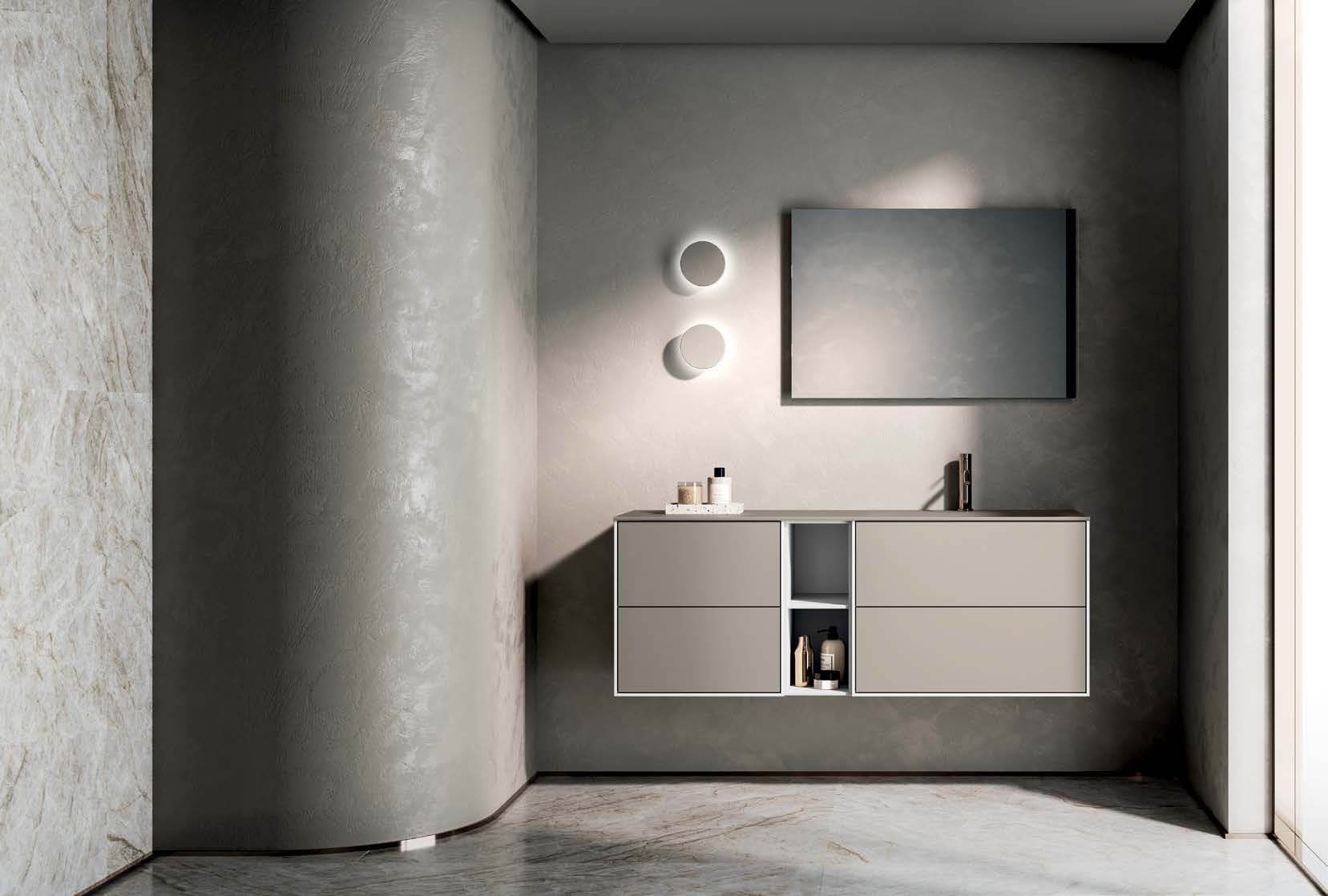 Le lavabo intégré en matériau résistant s'intègre parfaitement aux lignes du meuble, tandis que le miroir coordonné (avec option d'éclairage LED) donne luminosité et définition à l'environnement de la salle de bain.