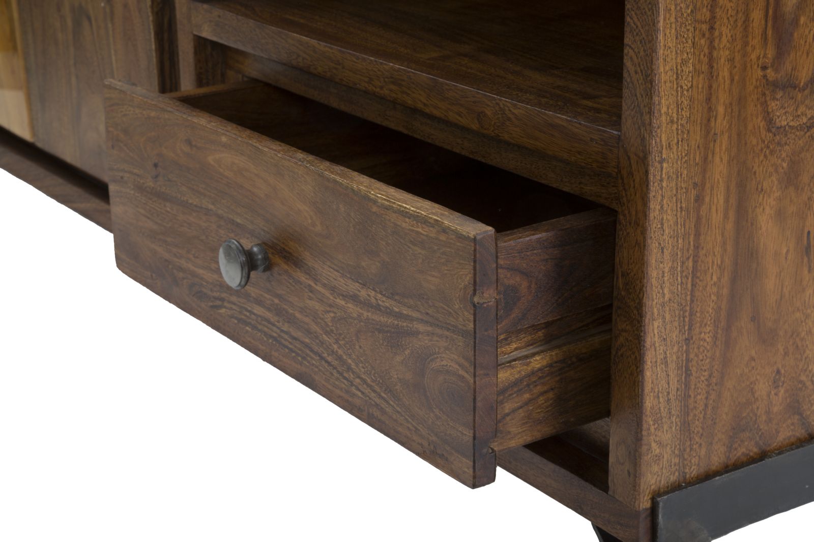 Elégant meuble TV en bois d'acacia massif composé de 2 étagères, 2 portes et 2 tiroirs. Le traitement particulier avec de la résine fixée sur les portes donne une touche de couleur et de modernité à une pièce extrêmement élégante et classique.