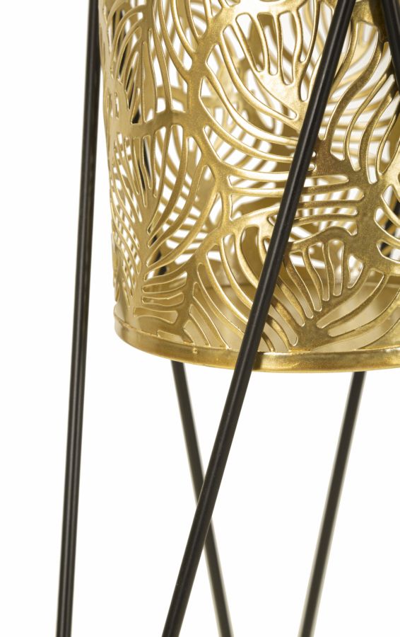 Paire de porte-vases en métal doré élégamment décorés de gravures rappelant des feuilles. Complet avec support en métal noir. Les pots sont amovibles des supports.