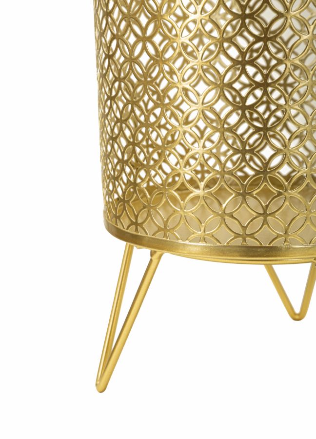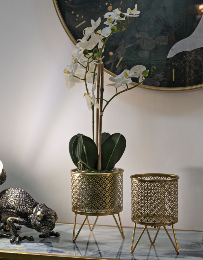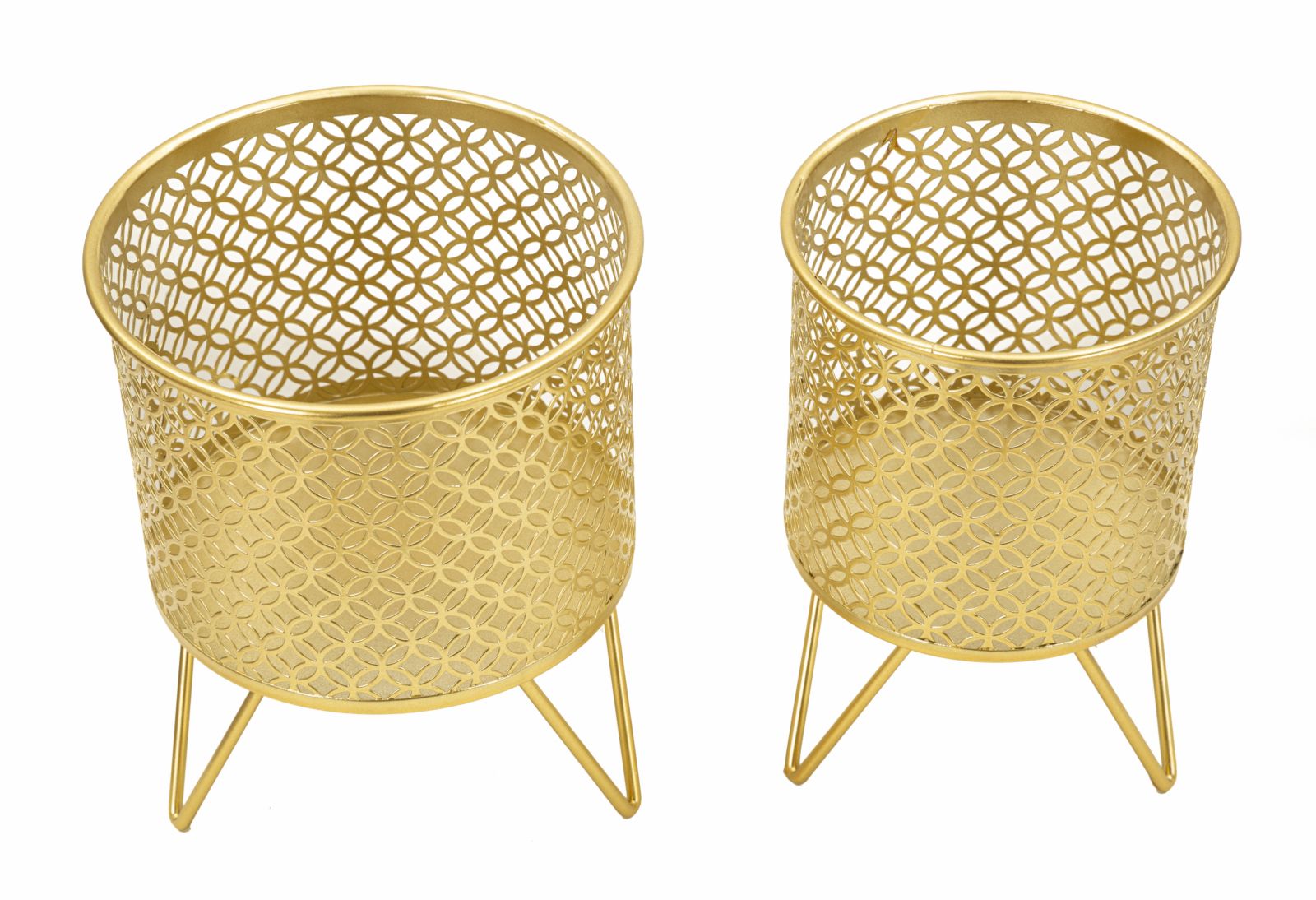 Paire de porte-vases en métal doré élégamment décorés de sculptures rondes entrecroisées. Complet de support en métal doré. Les pots sont amovibles des supports.