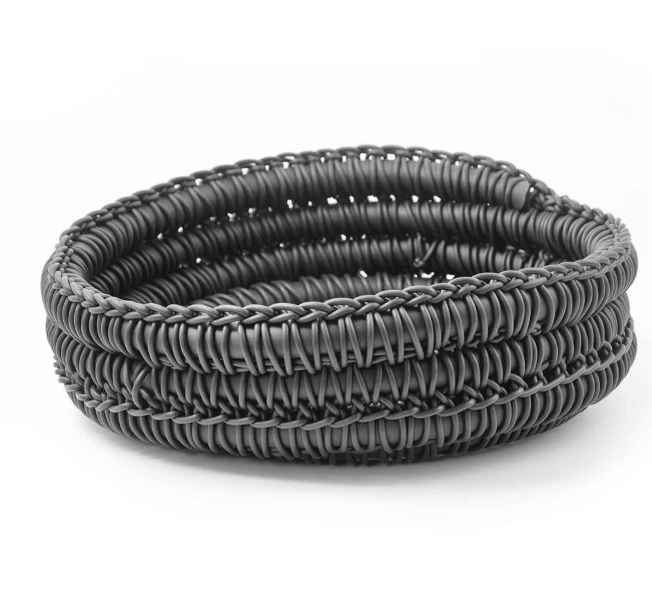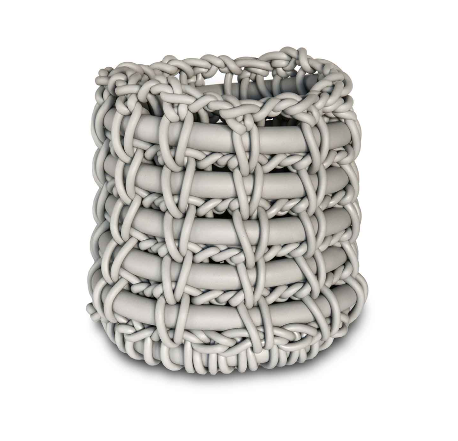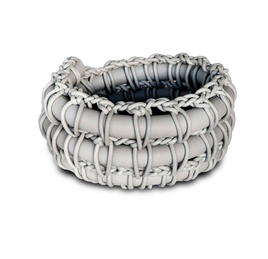 Le panier Nest est tricoté à la main avec du fil de néoprène double d'épaisseurs différentes, ce qui donne à la pièce une structure solide mais flexible.