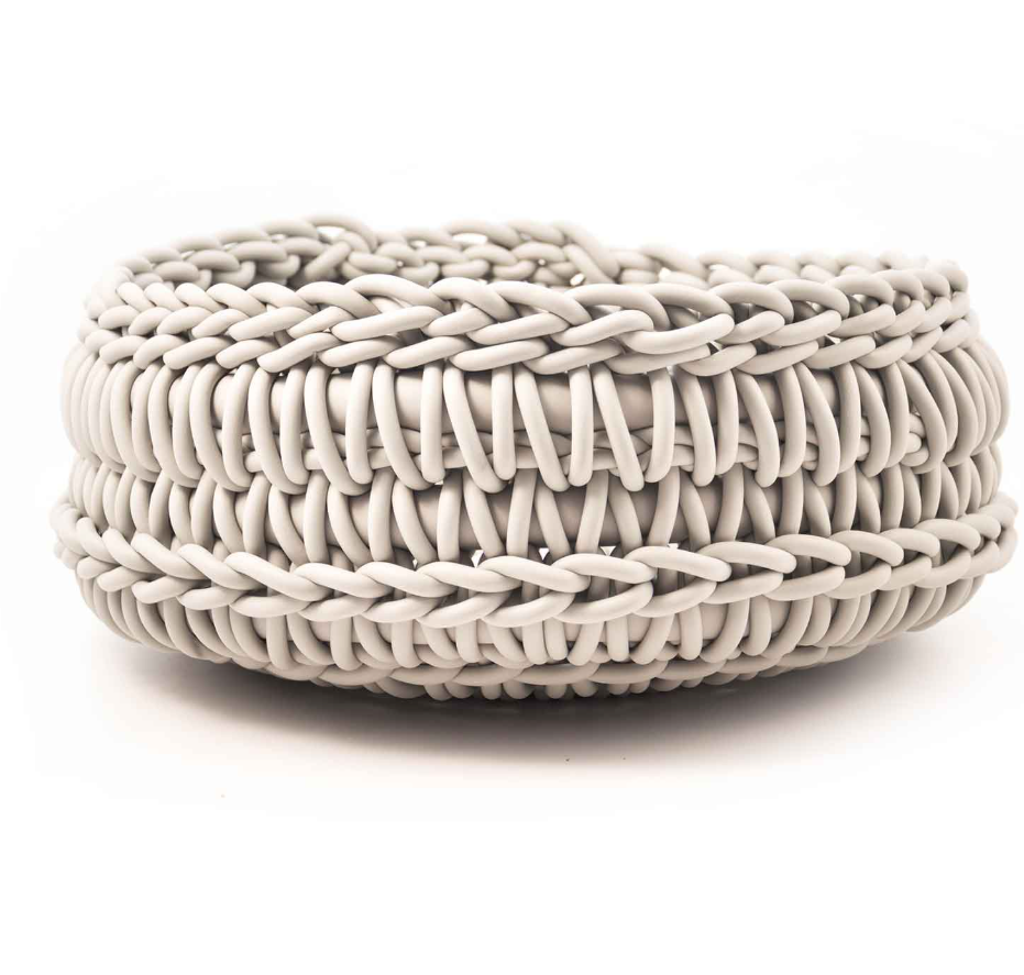 Panier nid tricoté avec du fil néoprène, une combinaison de douceur et de précision artisanale.
